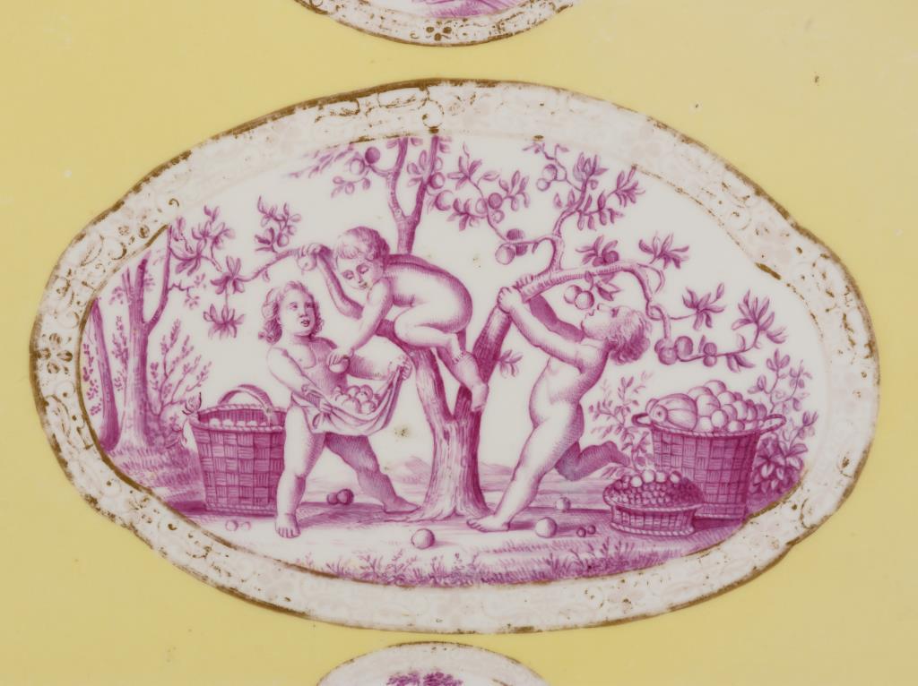 Tablett mit Rocaillehandhaben. In goldspitzengerahmten Kartuschen purpurfarben gemalte Puttenszenen. Berieben.