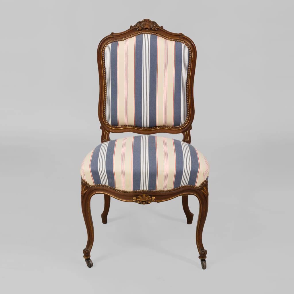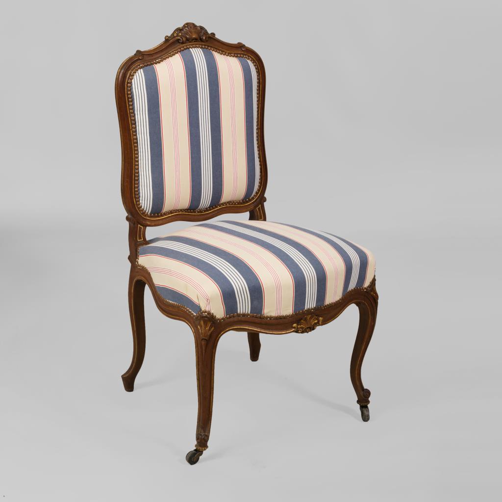 Lehnstuhl in stiltypischer Formgebung, verziert mit Rocaillenschnitzereien und goldfarbenen Akzenten, Polster mit blau-weiß-rot-gestreiftem Bezug. Restauriert, Polster und Bezug ergänzt.