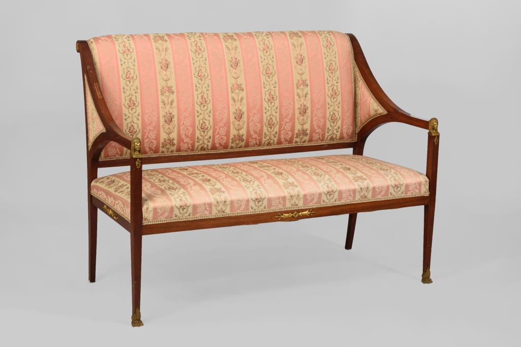 Sofabank im klassizistischen Stil mit antikisierenden Bronzeapplikationen, roséfarben gestreifter Bezug mit Blumen. Alters-/Gebrauchsspuren, Polster und Bezug ergänzt.