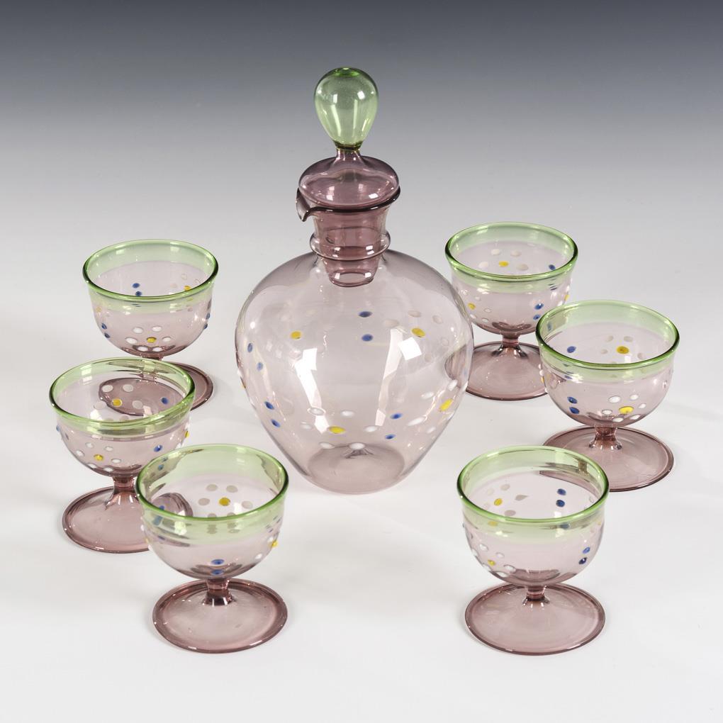 7-teilig. Violettes und grünes, lampengeblasenes Glas, polychrome Emailpünktchen. H Karaffe 15,5 cm, H 6 Likörgläser 5,5 cm.