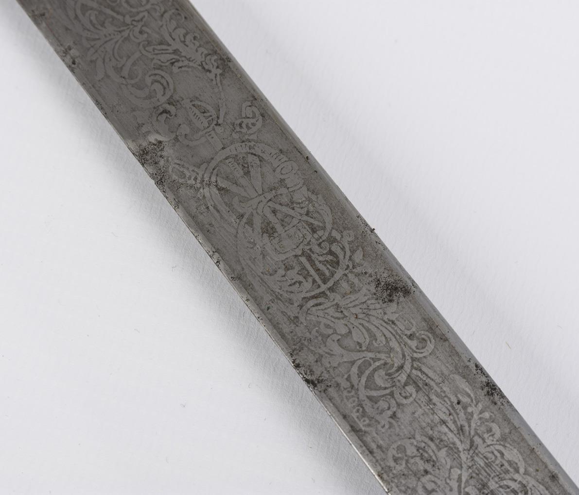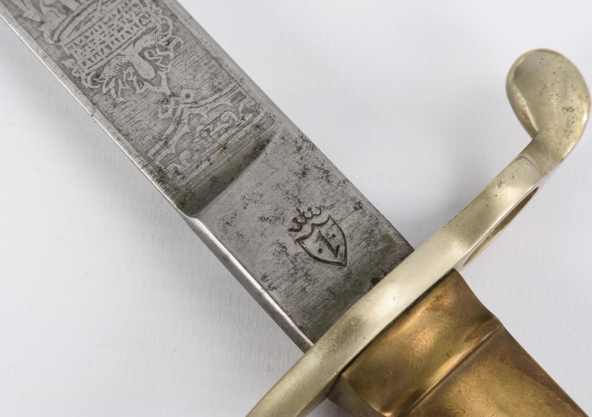 Wohl Eigentumswaffe mit geätzter Klinge, Messinggriff und schwarzer Lederscheide. Alters- und Gebrauchsspuren.