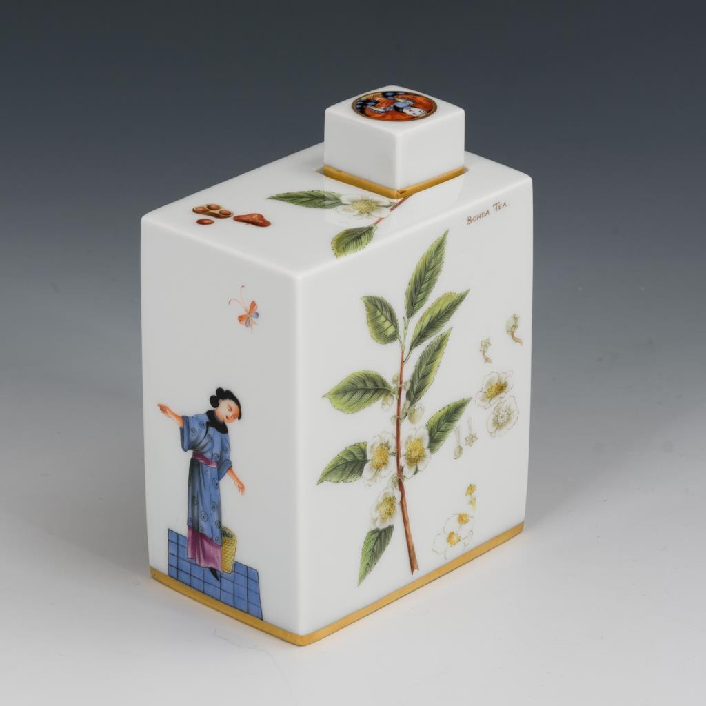 Rechteckige Dose mit der Darstellung des Teeanbaus und einer Teepflanze sowie mit Chinesenfiguren.