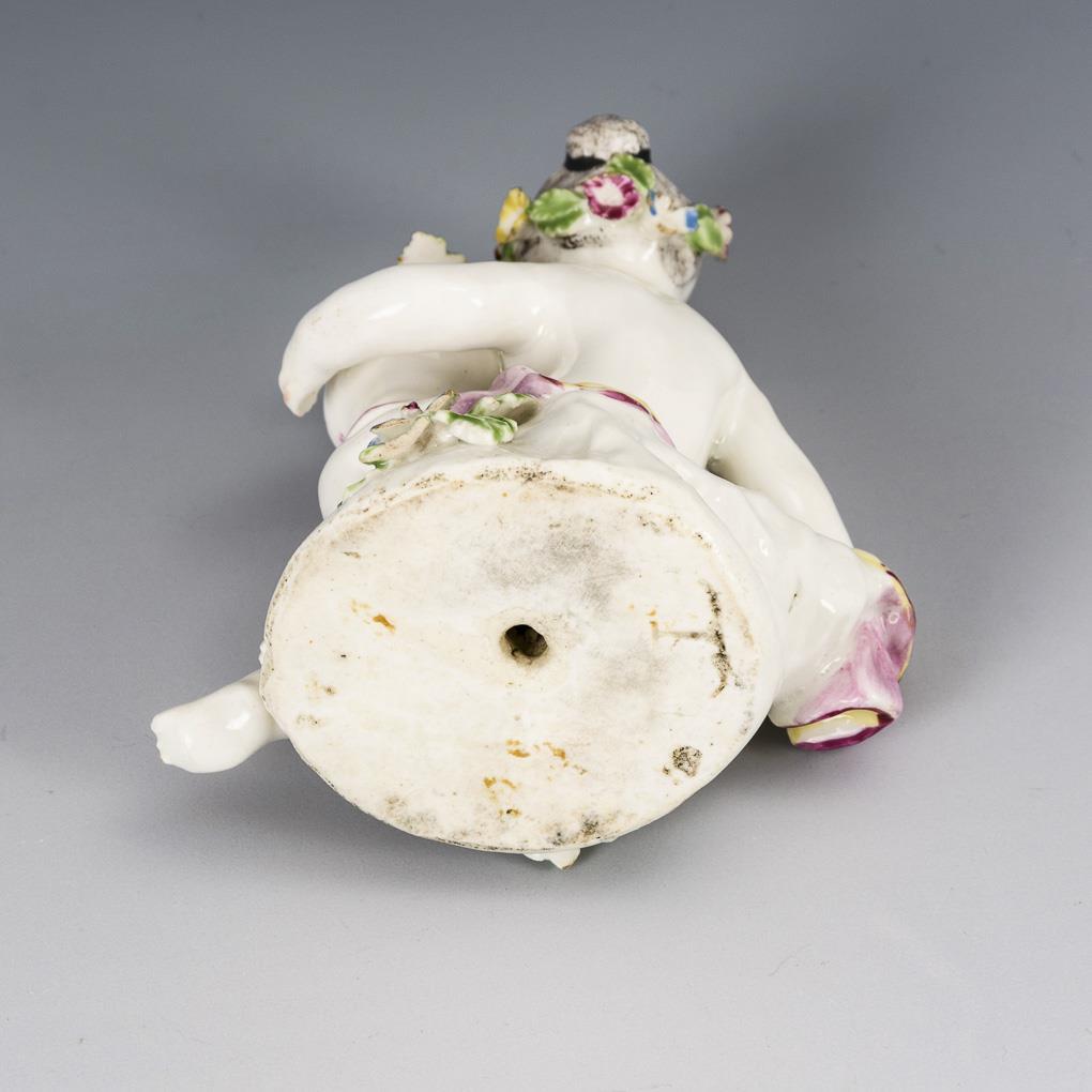 Auf einem Steinsockel an einer Blumenvase sitzendes Puttenmädchen. Bestoßungen an Blüten und Blättern, 1 Finger bestoßen.