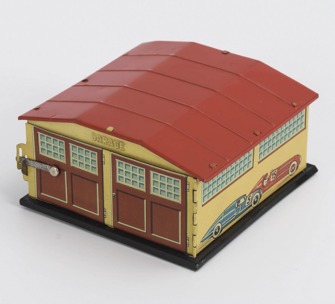 Bedruckte Garage mit rotem Dach. Dazu dunkelblaue und rote Limousine, jeweils mit intaktem Uhrwerk. Geringe Spielspuren, ohne Schlüssel.
