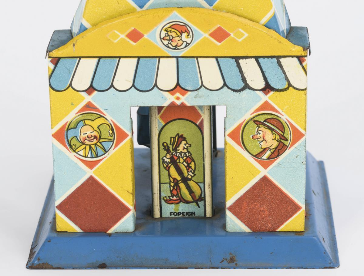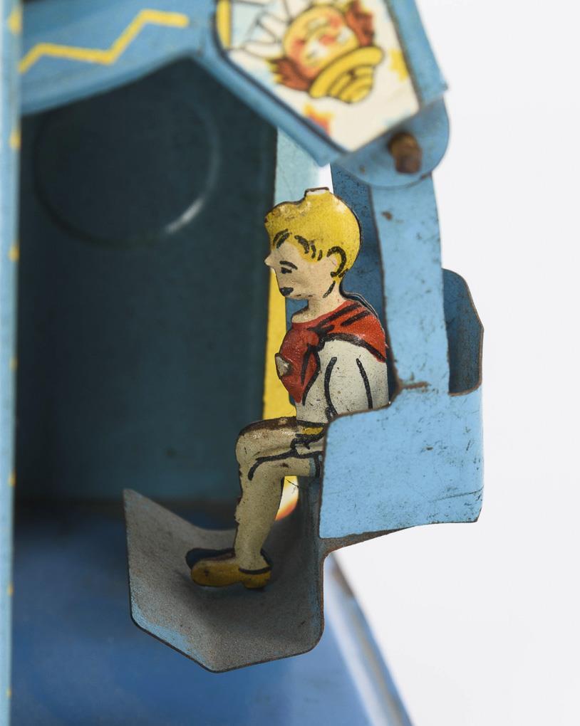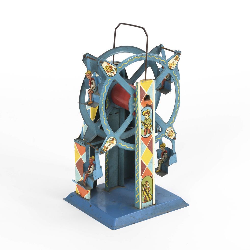 Riesenrad mit 4 Gondeln und Klingelton. Uhrwerk intakt, kleine Lackdefekte, Schlüssel fehlt.