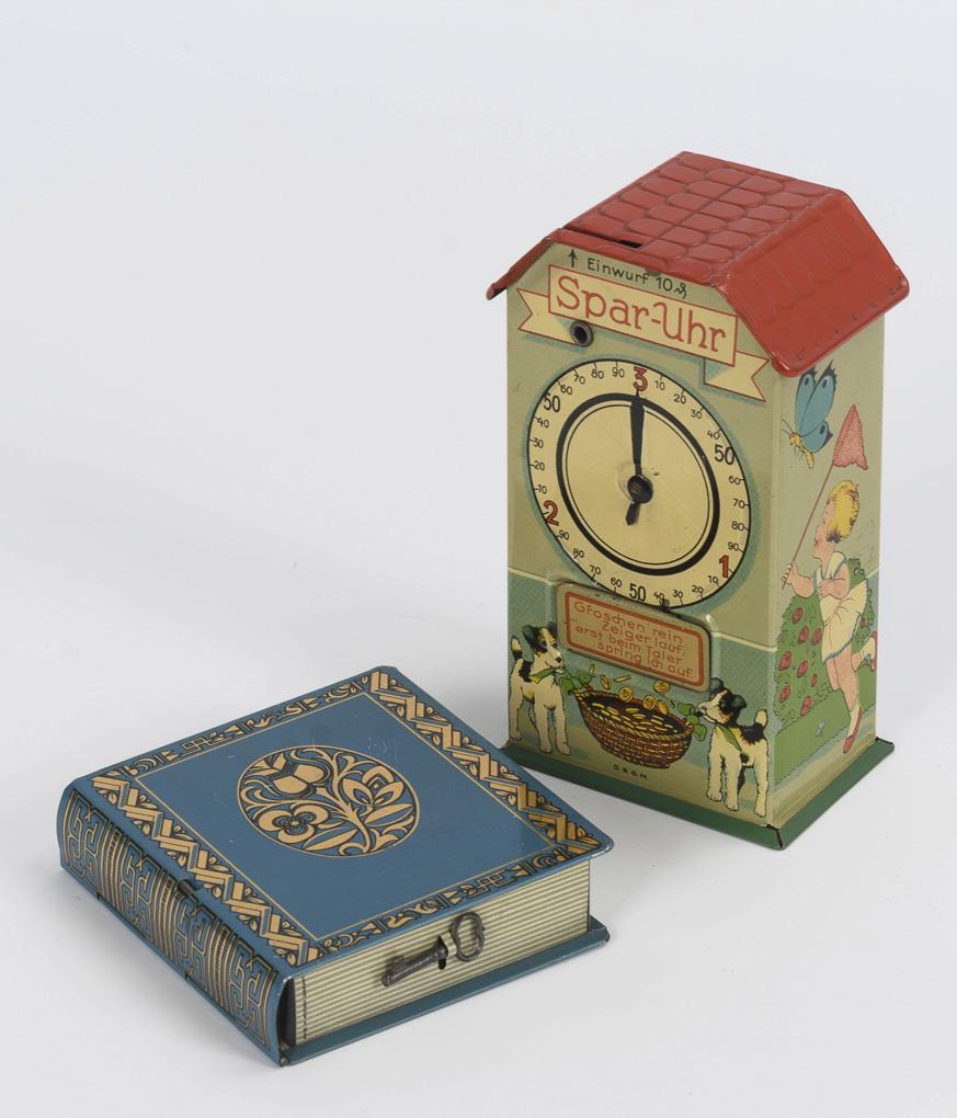 "Spar-Uhr" und Registrier-Spardose "Sparbuch". 1x mit Schlüssel. 1 Zeiger fehlt. Funktion nicht geprüft.