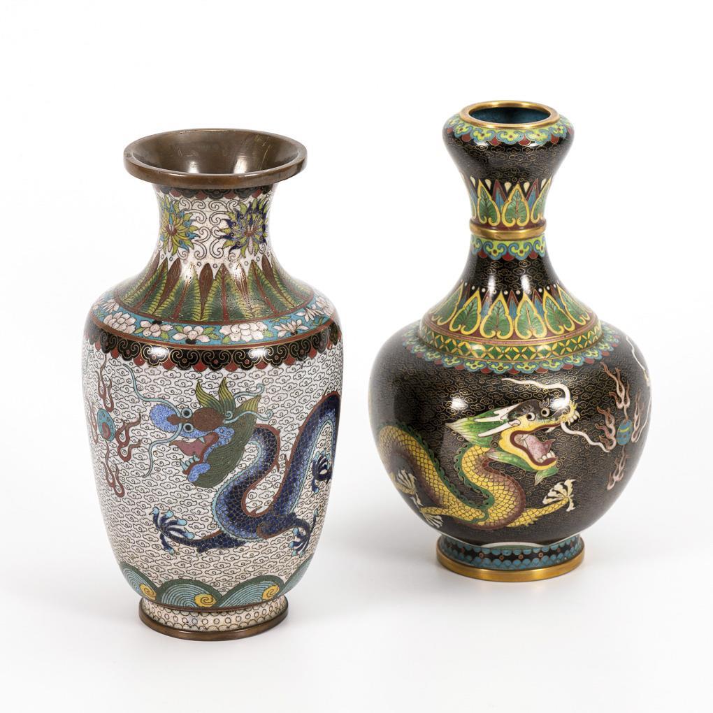 2 verschiedene Cloisonné-Vasen mit Drachendekor.
