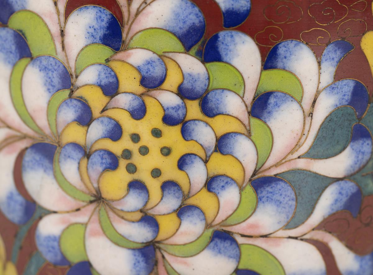 Schlanke Vasen in gleicher Form, mit Wolkenmuster und farbkräftigen Chrysanthemen und Päonien auf rotbraunem und hellblauem Grund.