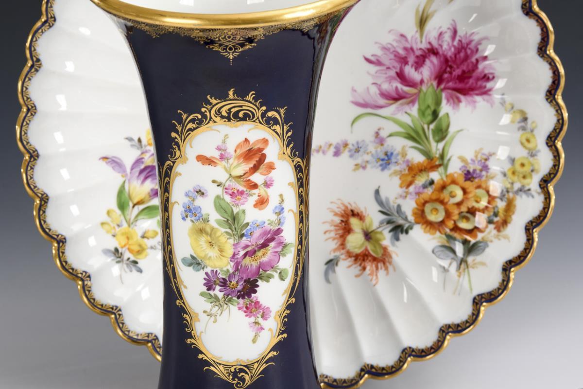 1x Flötenvase mit Kobaltfond und Blumenmalerei. / Fächerplatte mit goldstaffiertem Kobaltrand und Blumenmalerei. Randrestaurierung an der Fächerplatte.