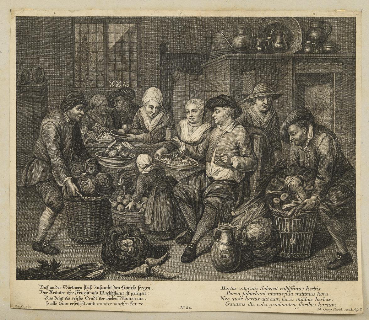 Darstellung einer Küchenszene mit Bauern und Bäuerinnen nach der Ernte, Begleittext in deutscher und lateinischer Sprache "Daß an des Gärtners Fleiß zusambt des Himmels Seegen, Der Kräuter ihre Frucht und Wachsthum ist gelegen; Das zeigt die reiche Erndt der vielen Blumen an, so alle Sinne erfrischt, und mancher machen kann", "No. 20"; nach einem Gemälde von Vanaße. Zum Plattenrand beschnitten, griffspurig, stockfleckig.