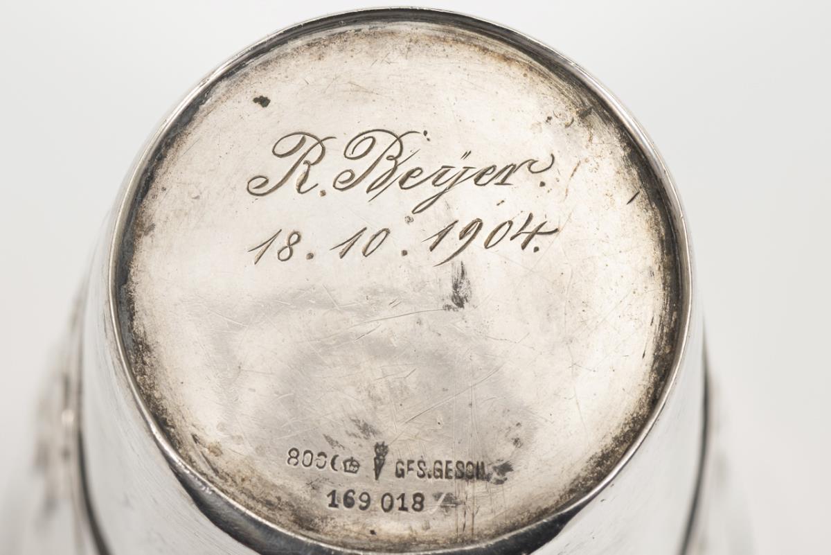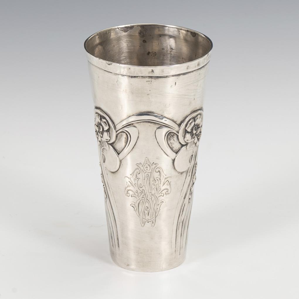Konischer Becher mit Floralrelief und verschlungener Monogrammgravur. Unterseitig bezeichnet und datiert "R. Beyer. 18.10. 1904". Gebrauchsspuren, mehrere Dellen.