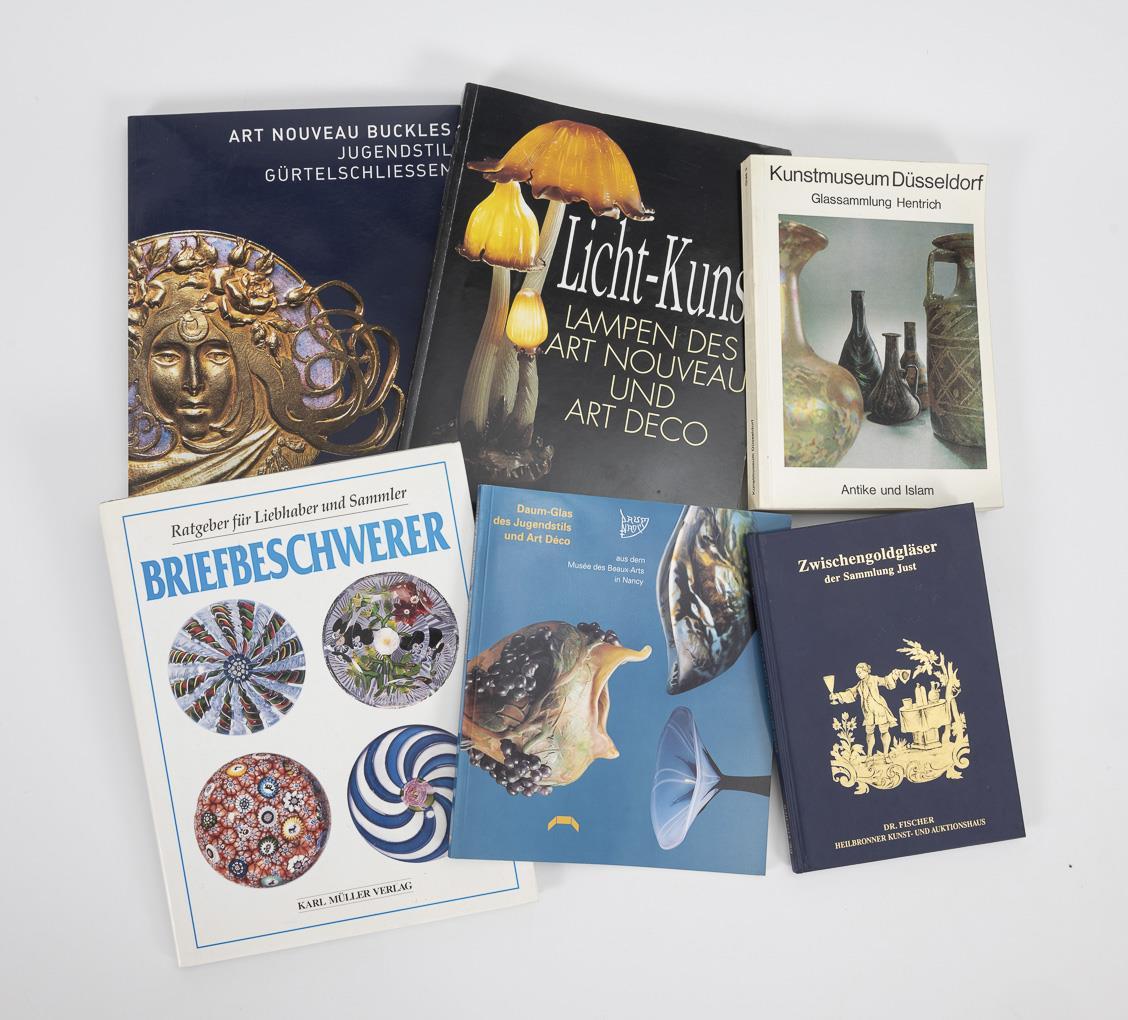 "Jugendstil Gürtelschliessen", Arnoldsche 2000, 232 Seiten, Broschur. / Wolf Uecker: "Licht-Kunst Lampen des Art Nouveau und Art Deco", 280 Seiten, Broschur. / Rossi: "Briefbeschwerer - Ratgeber für Liebhaber und Sammler", Karl Müller Verlag 1995, 96 Seiten. / "Daum Glas des Jugendstils und Art Déco aus dem Museé des Beaux-Arts in Nancy", Badisches Landesmuseum 1995, 110 Seiten Broschur. / "Glassammlung Hentrich - Kunstmuseum Düsseldorf - Antike und Islam", Düsseldorf 1974, 426 Seiten, Broschur. / "Zwischengoldgläser der Sammlung Just", 115 Seiten, Auktionskatalog mit Einführungstext. Fester Einband.