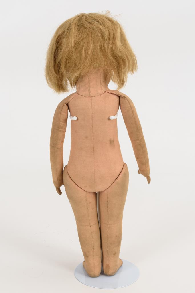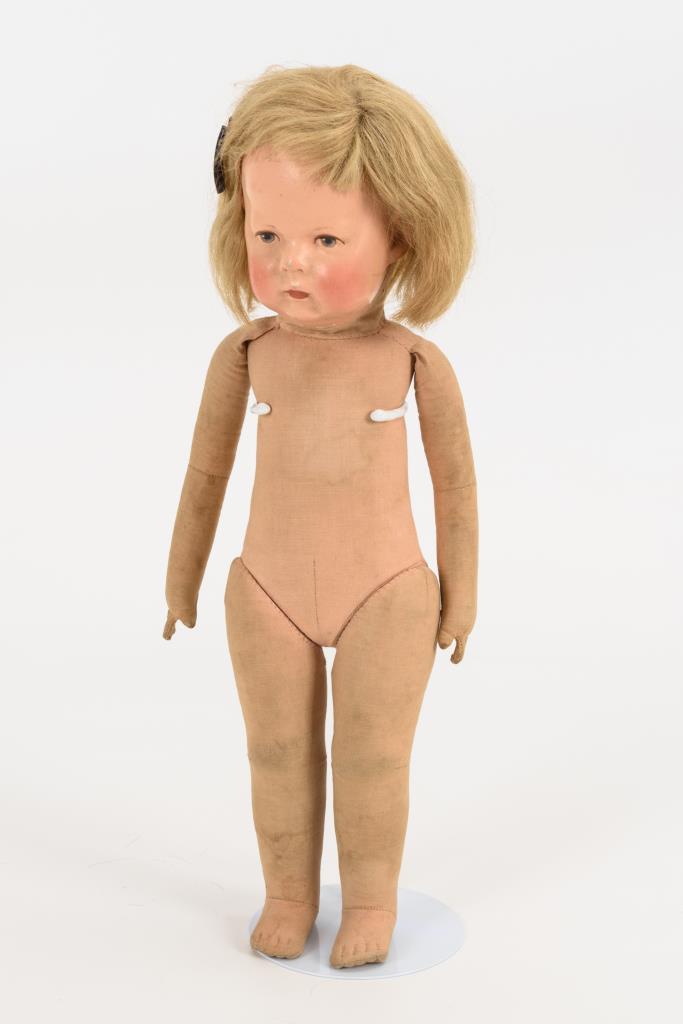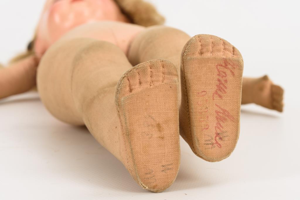 Festgenähter Stoffkopf mit 3 Hinterkopfnähten und bemalter Gesichtsmaske (Hinterkopf unbemalt). Stoffkörper mit locker angenähten Armen, Beine mit Scheibengelenken. Grünes Kleid mit weißer Schürze, rote Schuhe. Nasenspitze bestoßen, minimale Retuschen im Gesicht, Körper verschmutzt, 2 Nähte am Armansatz lose.