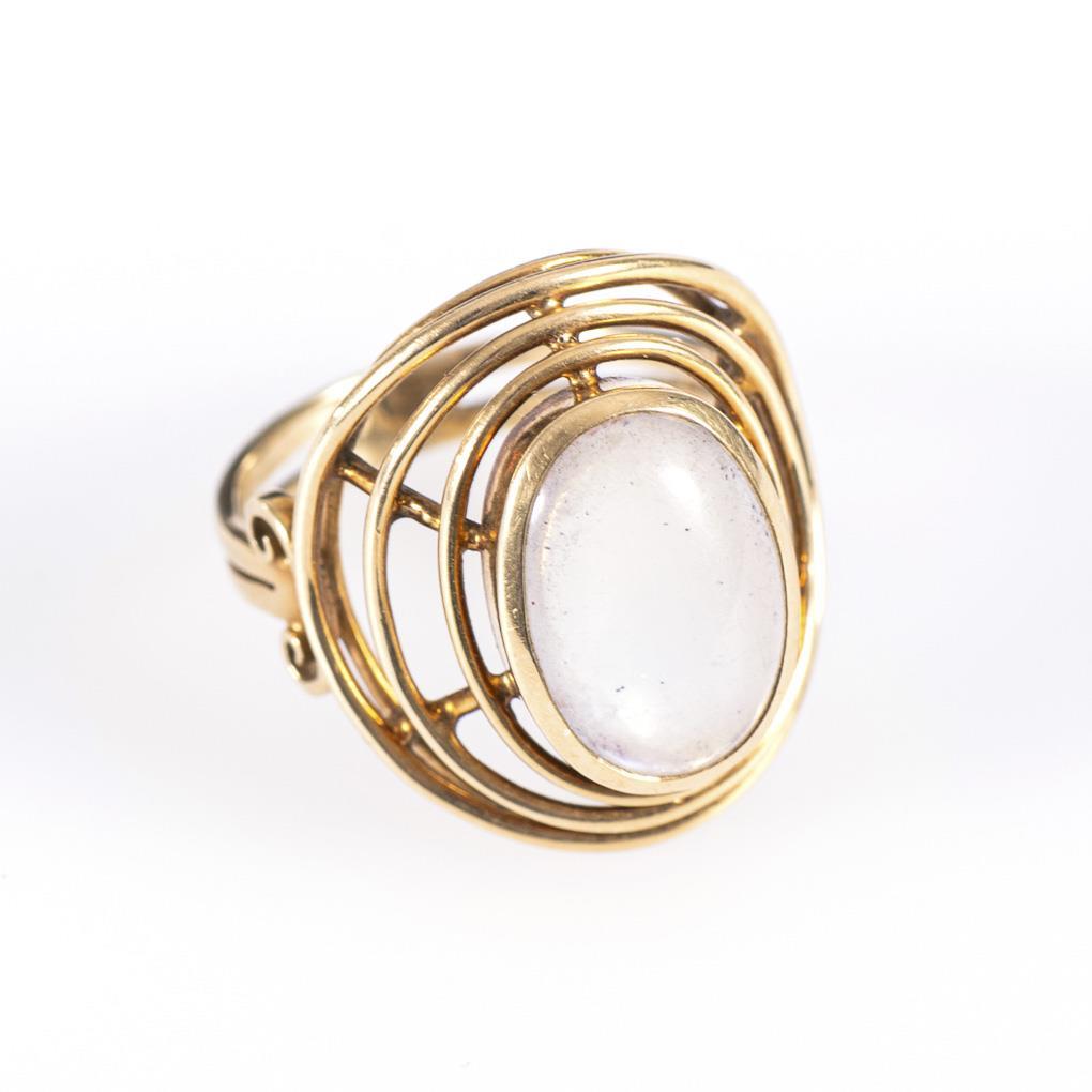 Zargengefasster Cabochon in 3-stegigem Ringkopf zwischen 2-stegiger Schiene.