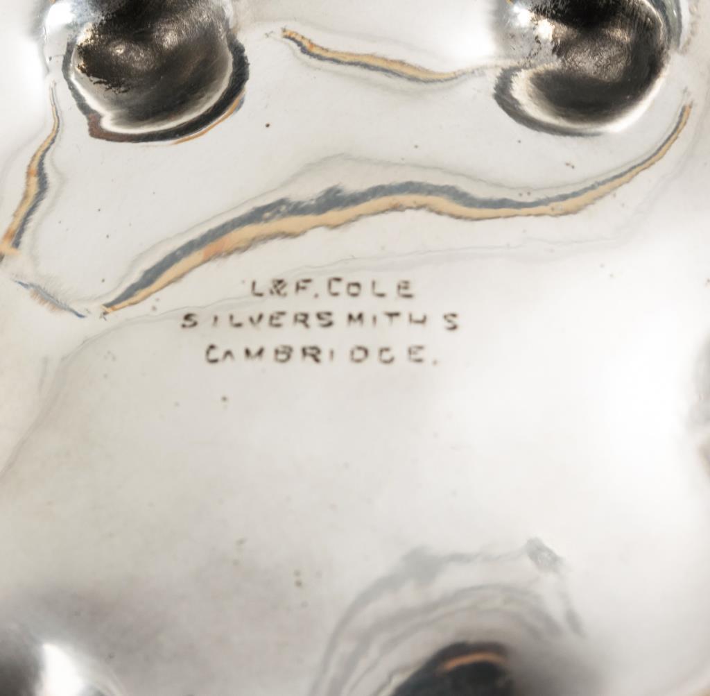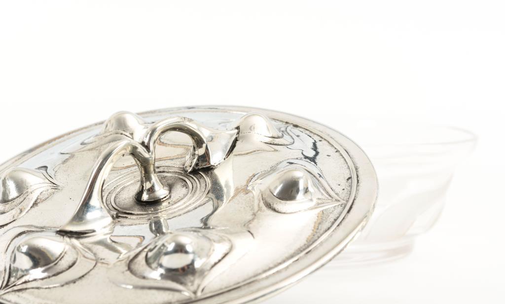 6-eckiger Teller und runder Deckel aus Zinn je reliefiert; ornamental geätztes Glas mit Konturschliff.