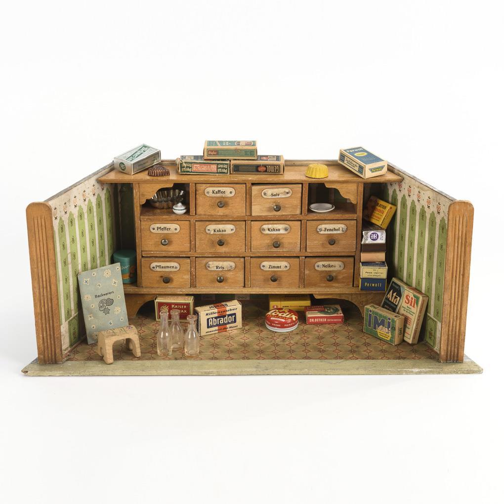 Trapezförmiges Gehäuse mit Jugendstil-Tapete und festem Regaleinbau mit 10 beschrifteten Schüben. Dazu einige Schachteln und Dosen. Bespielt, leichte Altersspuren.