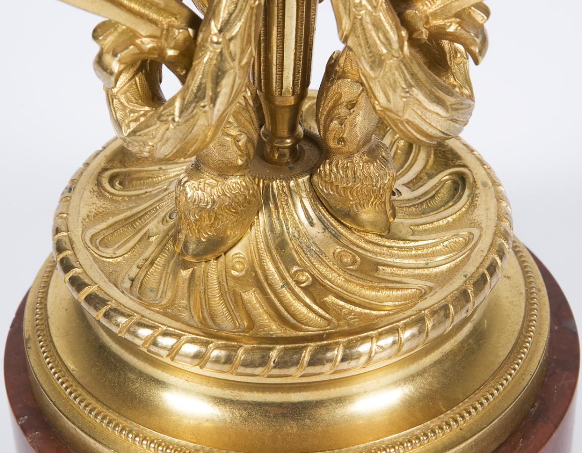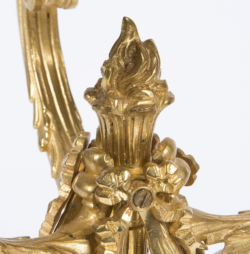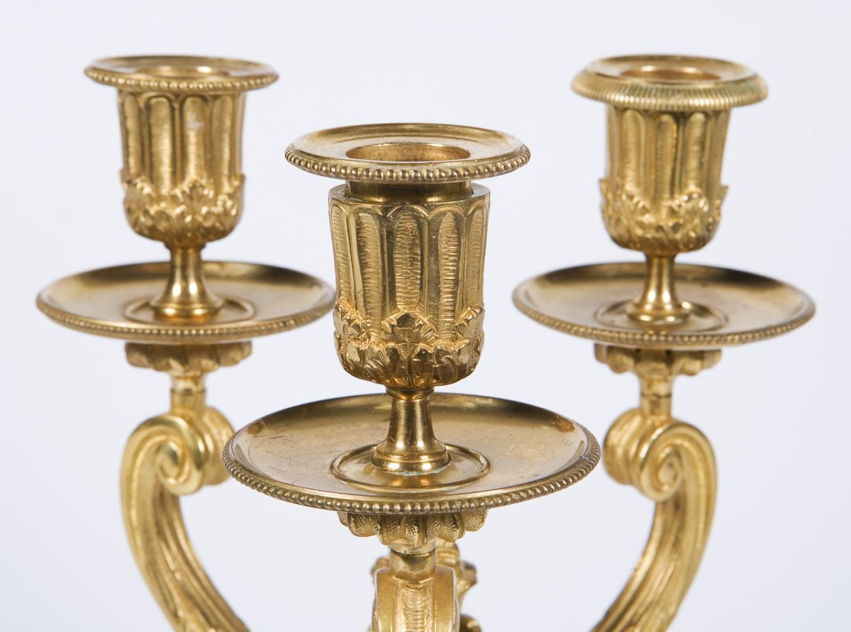 Im Stil von Jean Charles Delafosse (1734-1789, Ornamentkünstler, Zeichner, Kupferstecher, Architekt). 3-flammige verschraubte Standleuchter mit volutenförmig geschwungenen Leuchterarmen und wuchtigen Lorbeerblatt-Festons auf Bocksbeinen. Schaft mit Flammenbekrönung. Stufig abgesetzter Standfuß mit ornamentalem Dekor. Plinthen leicht bestoßen.