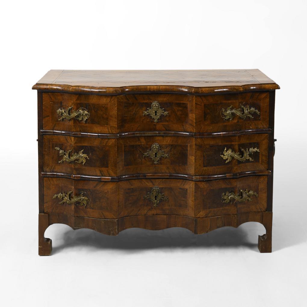 3-schübige Kommode mit geschweiftem Korpus auf Hakenfüßen, Deckplatte parkettiert, Schübe mit Maserfurnier kassettiert; dekoriert mit üppigen Akanthusblatt-Messinggriffen und Medusenhaupt-Schüsselbeschlägen; Schlösser ohne Schlüssel, lose beiliegend. Bügelgriffe an den Seitenwänden. Alters-/Gebrauchsspuren, restaurierungsbedürftig.