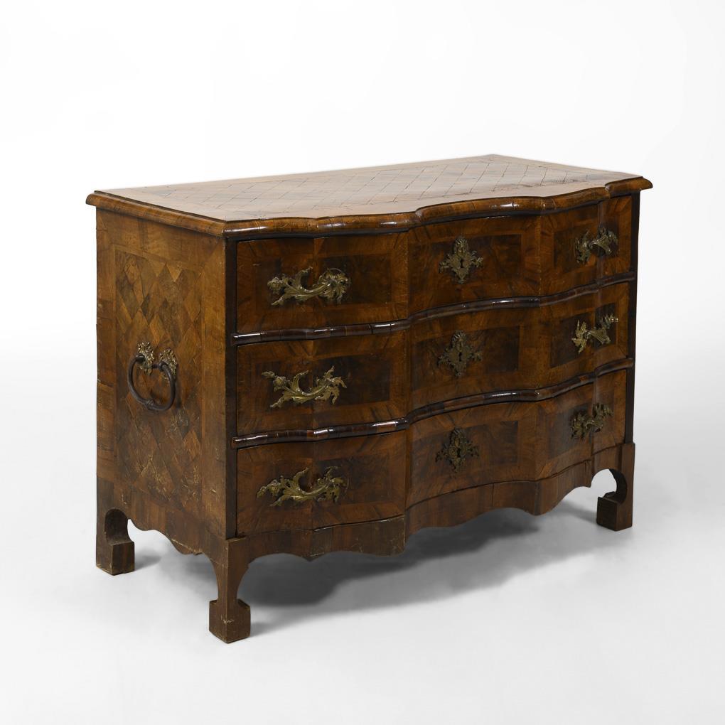 3-schübige Kommode mit geschweiftem Korpus auf Hakenfüßen, Deckplatte parkettiert, Schübe mit Maserfurnier kassettiert; dekoriert mit üppigen Akanthusblatt-Messinggriffen und Medusenhaupt-Schüsselbeschlägen; Schlösser ohne Schlüssel, lose beiliegend. Bügelgriffe an den Seitenwänden. Alters-/Gebrauchsspuren, restaurierungsbedürftig.