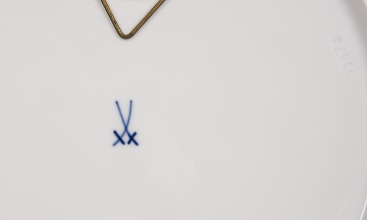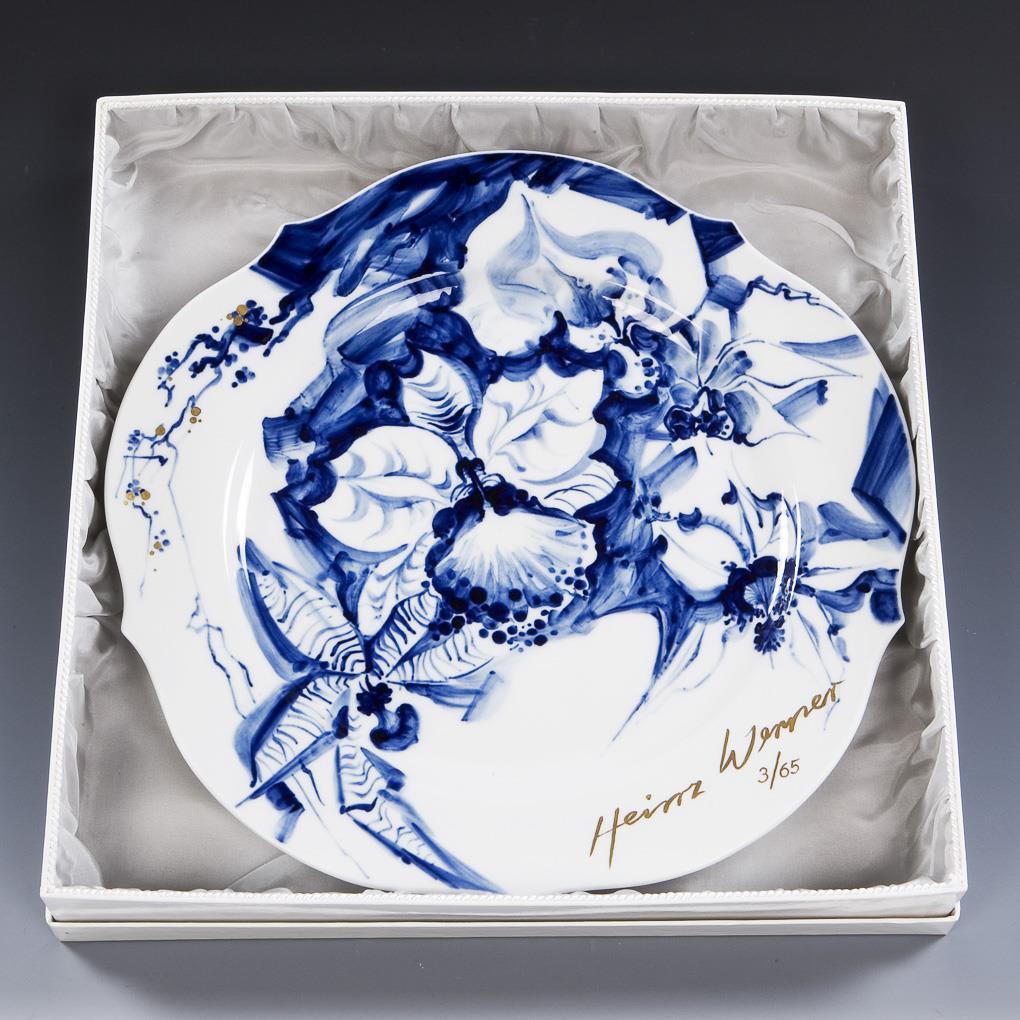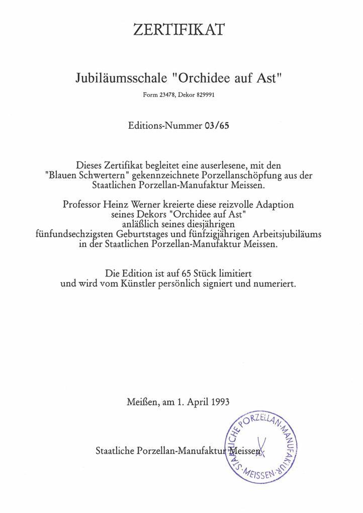 Limitiert, nummeriert: 03/65. Dekor-Nr. 829991. Kobaltblaue Unterglasurmalerei mit Goldpunkten. Dekor "Orchidee auf Ast". Rückseitig montierte Öse zum Aufhängen. Pressmarken, Schwertermarke, vom Künstler persönlich signiert und nummeriert. Mit Zertifikat, im Original-Meissen-Karton.