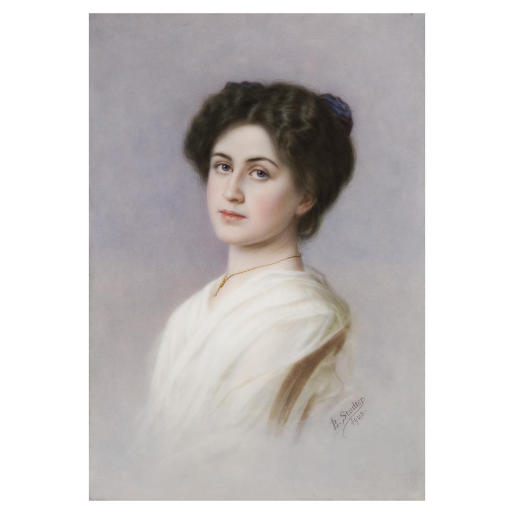 Anmutig-natürlich wirkendes Halbbildnis einer jungen hübschen Dame. Feine farbige Bemalung in zartem Kolorit. Signiert: B. Stadter. Unglasierter Boden, Pressmarken.