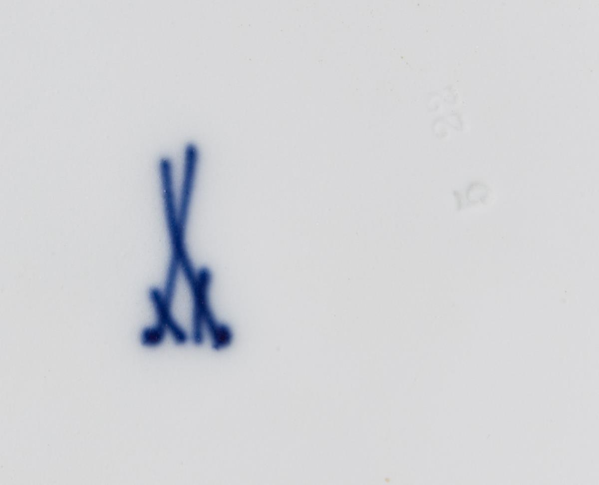 Farbig bemalt, Goldstaffage. Dekor-Nr. 220110, "Blumen- und Insektendekor". Form "Neuer Ausschnitt". Pressmarken, Malermarken, Schwertermarken.