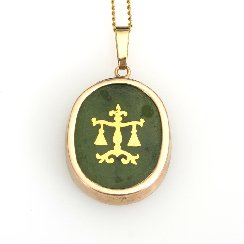 Zargengefasste Jadetafel mit eingelegtem Waage-Motiv. Zarte Panzerkette mit Ringfederschließe.