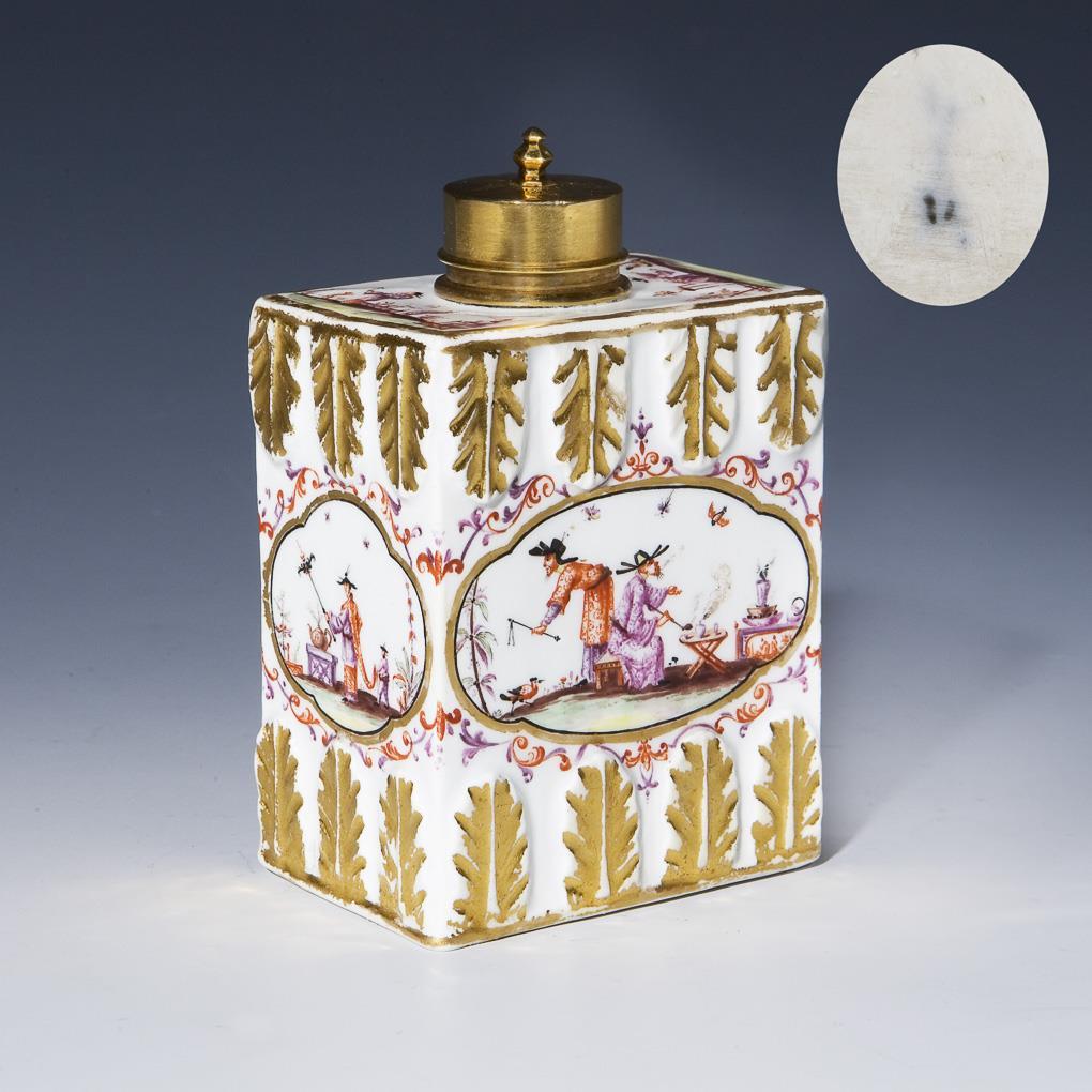 Allseits feine farbige Bemalung mit sechs verschiedenen Chinoiserien nach Johann Gregorius Höroldt. Umlaufend reliefierte Akanthusblatt-Bordüren mit vergoldeten Rippen. Vergoldete Metall-Montierung mit Haubendeckel. Unglasierter Boden, Formerzeichen von Caspar Meißner senior (1689 Scharffenberg - 1751 Meißen), Mitarbeiter von Johann Friedrich Böttger. Schwertermarke |Nachtrag 19.06.22: teils minimale, nicht sichtbare Restaurierungen an den Ecken. Gold partiell berieben.