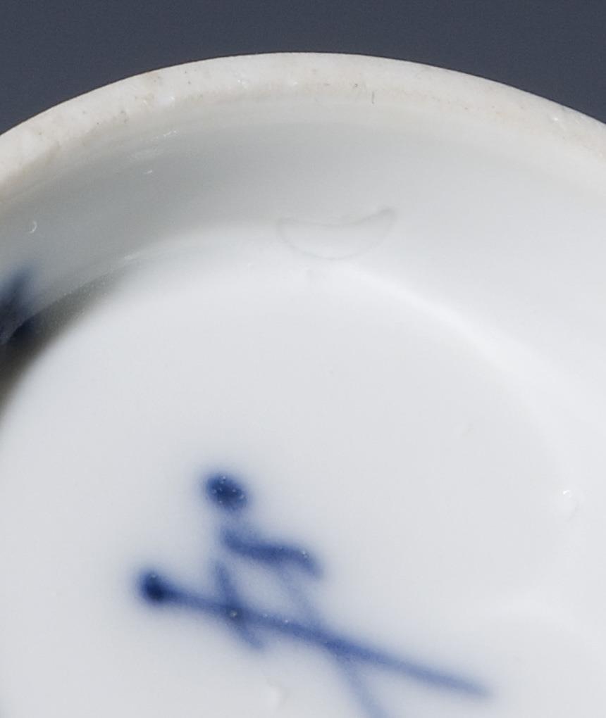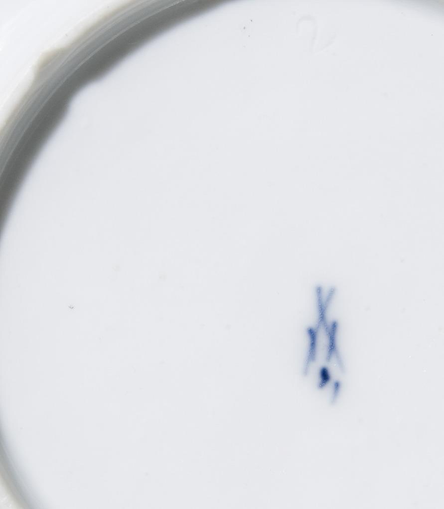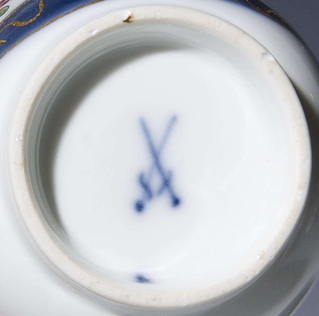 Kobaltblaue Unterglasurmalerei, farbige Aufglasurmalerei, gold schattiert, "Tischchendekor". Blaue Malermarken, Schwertermarken, Untertasse mit Pressmarke, auf der Tasse Formerzeichen von Johann Gottlob Pietsch (1716-1761), seit 1733 an der Manufaktur. Lippe partiell leicht restauriert, Untertasse rückseitig mit leichtem Glasurdefekt, Gold leicht berieben.