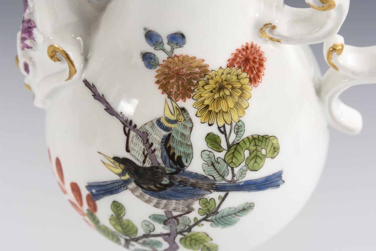Farbige, gold schattierte Bemalung nach Famille verte-Vorbild mit zwei Phantasievögeln auf einem Baum und Chrysanthemenblüten. Eisenrot, purpur, kapuzinerbraun und gold staffiert. Innen am Standring Formerzeichen von Johann Gottlieb Kühnel, um 1702-1774, als sein Dreherzeichen sind "zwey Nollen" genannt, Schwertermarke. Innendeckel, Henkel, Ausguss restauriert.