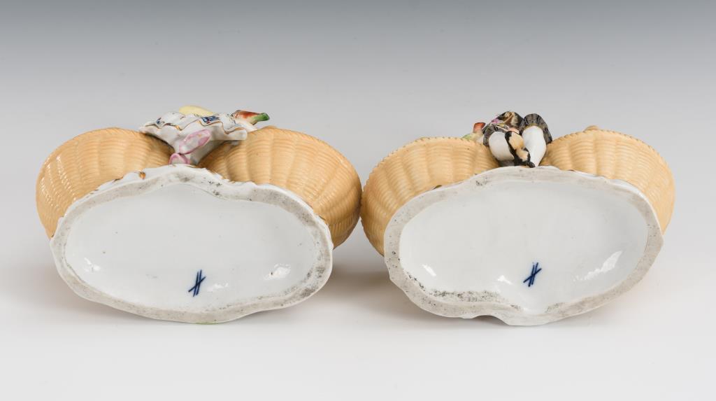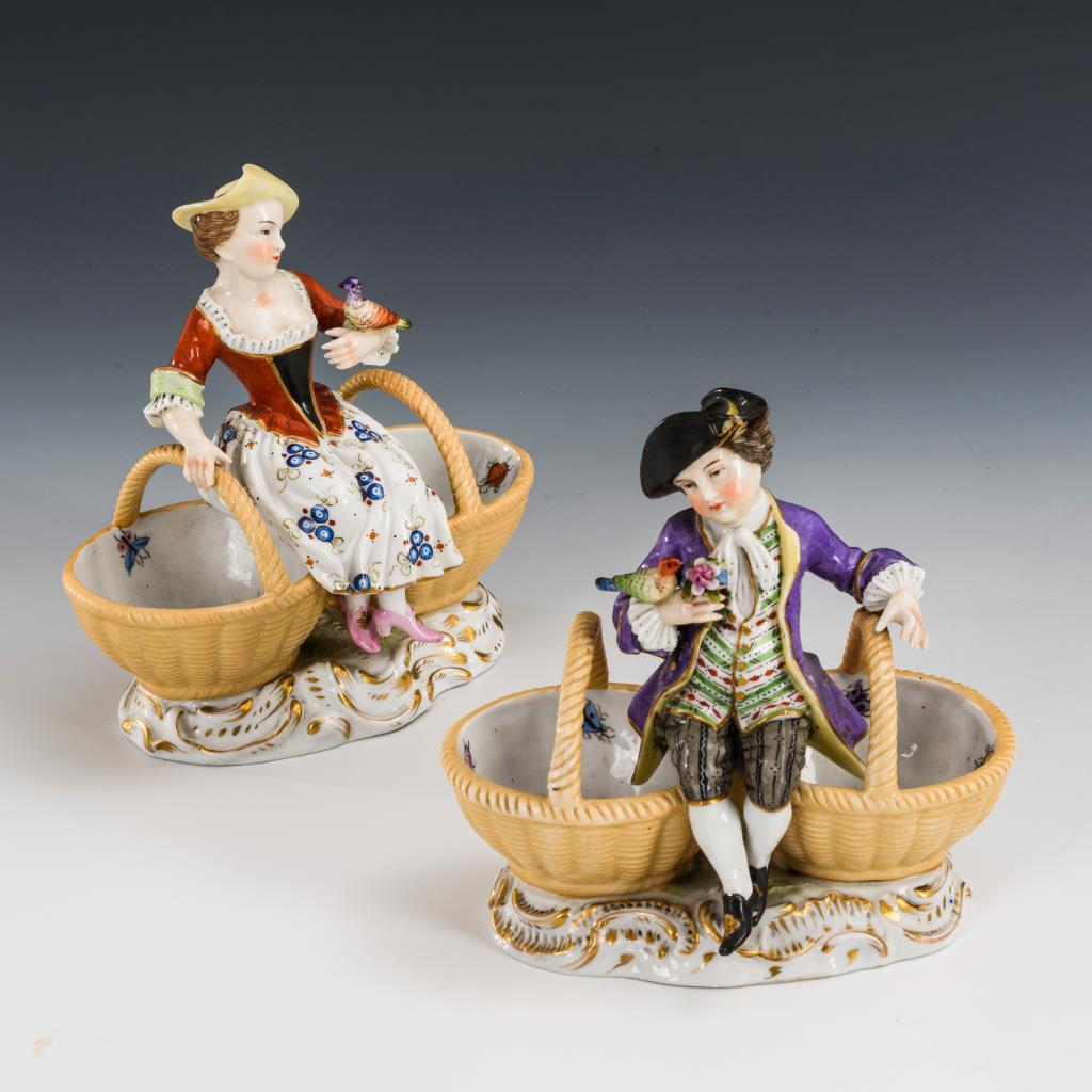 Zwischen zwei Körben sitzender Knabe bzw. Mädchen mit einem Vögelchen auf der Hand. Chip am Hut des Knaben.