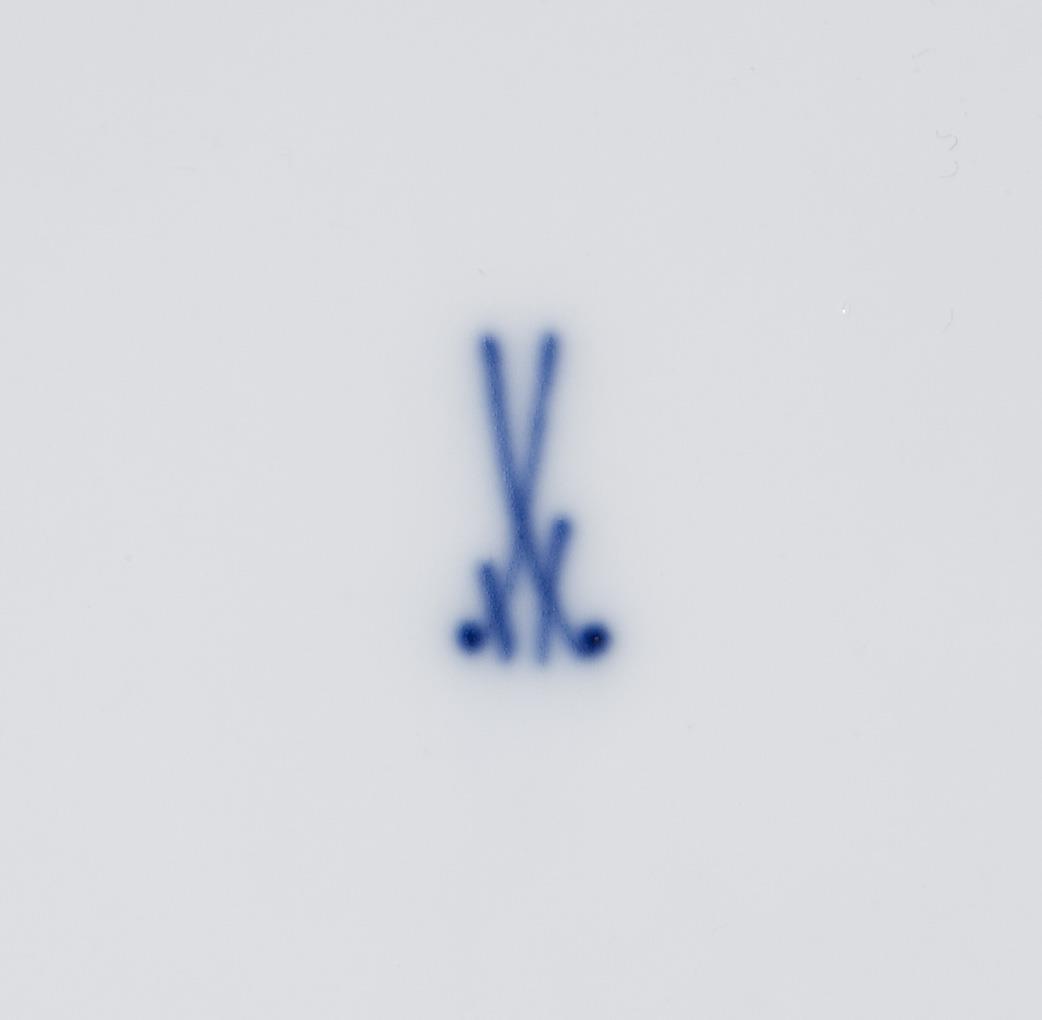 Zarte farbige florale Bemalung mit Blütenfestons, Einzelblüten und Blumenbukett. Gold staffierter Mosaikrand mit Rocaillen- und Gitterornamenten, Goldrand. Form "Neuer Ausschnitt". Pressmarke, Schwertermarke.