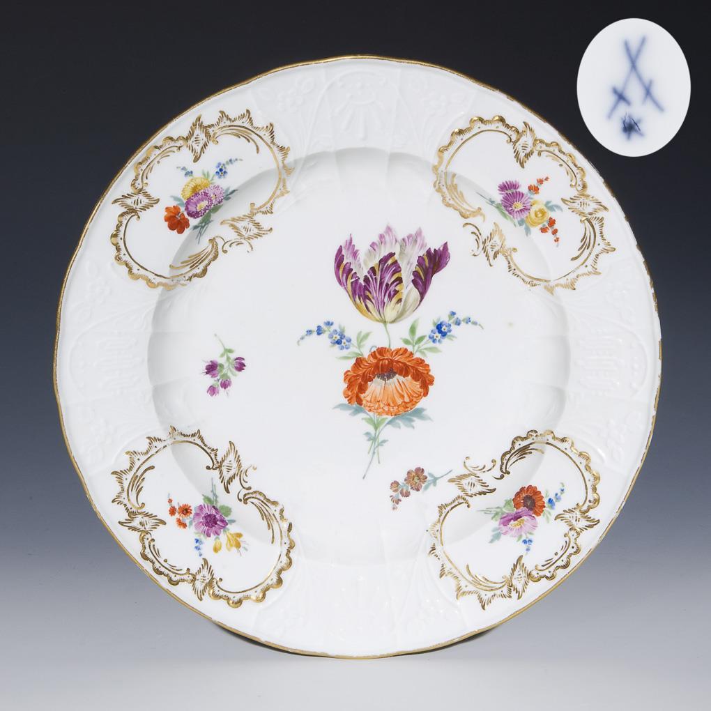 Reliefdekor "Dulong", Modell von Johann Joachim Kaendler 1743. Farbige Blumenbemalung, Goldstaffage. Pressmarke, Schwertermarke mit Stern.