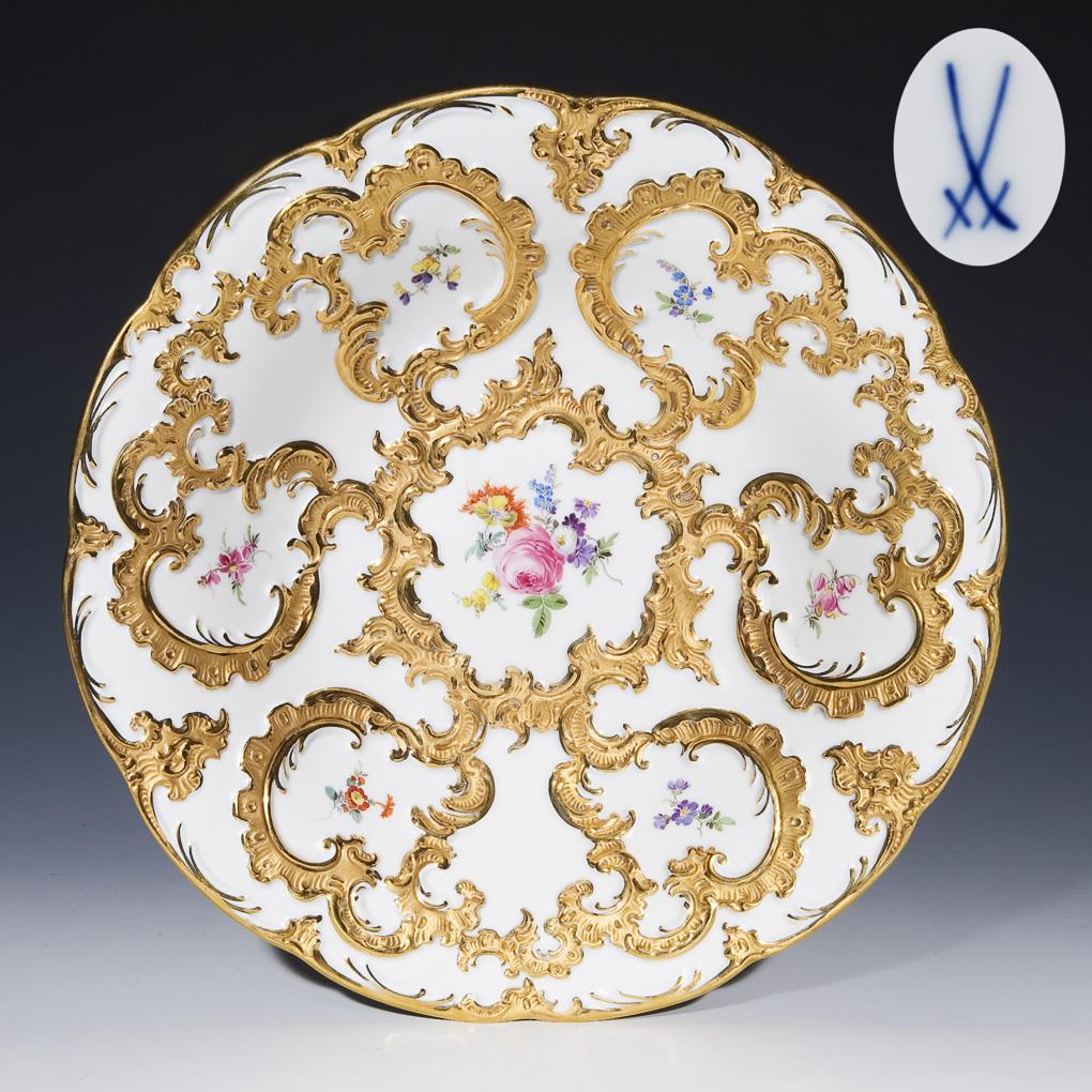Modell von Ernst August Leuteritz 1855-1860. Ornamental reliefiert, gold staffiert, mattiert und poliert, farbige Blumenbemalung, Goldrand. Pressmarken, Malermarken, Schwertermarke.
