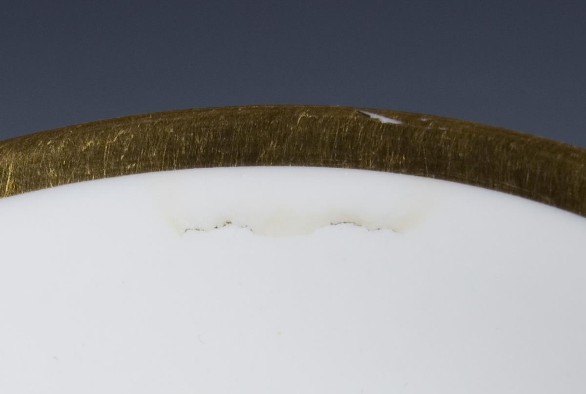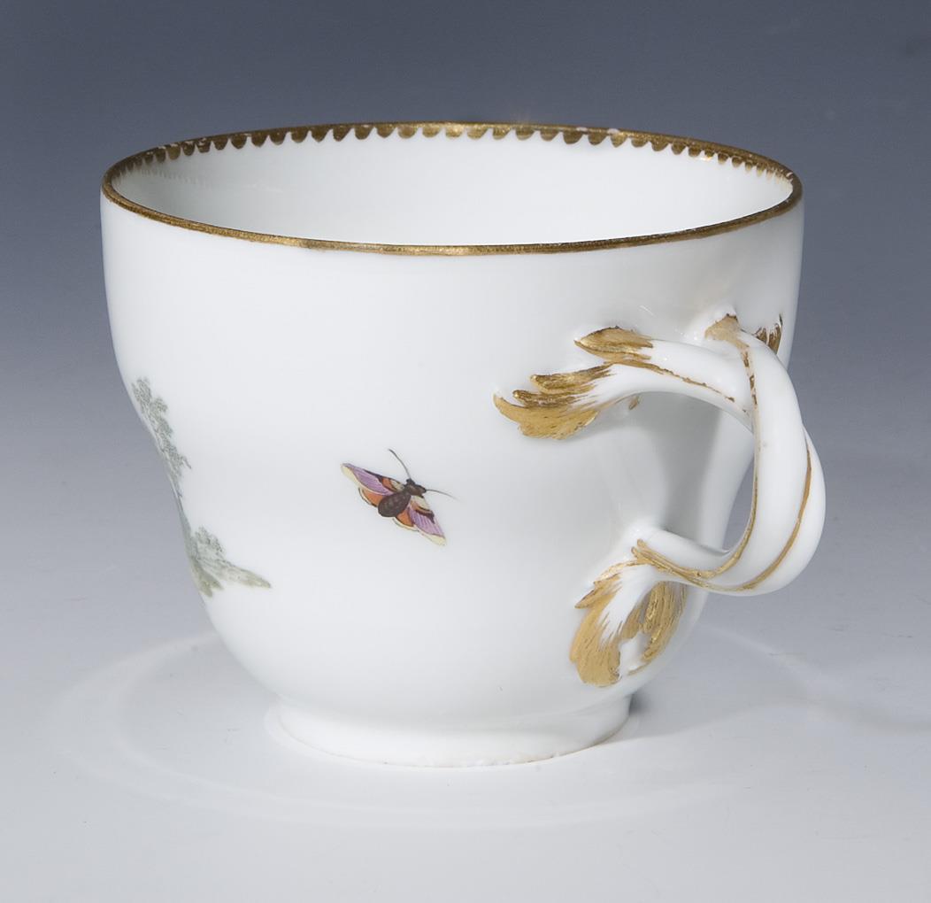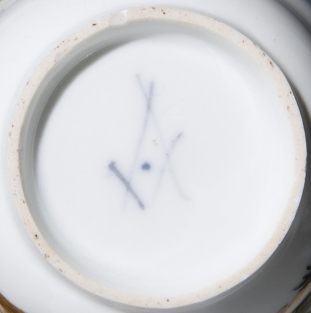 Farbig bemalt, gold staffiert. Frontal zwei Paradiesvögel in großflächiger Landschaftsinsel, rückseitig Insekten. Schwertermarken, eine Schwertermarke mit Punkt. Untertasse ergänzt, am Rand bestoßen.