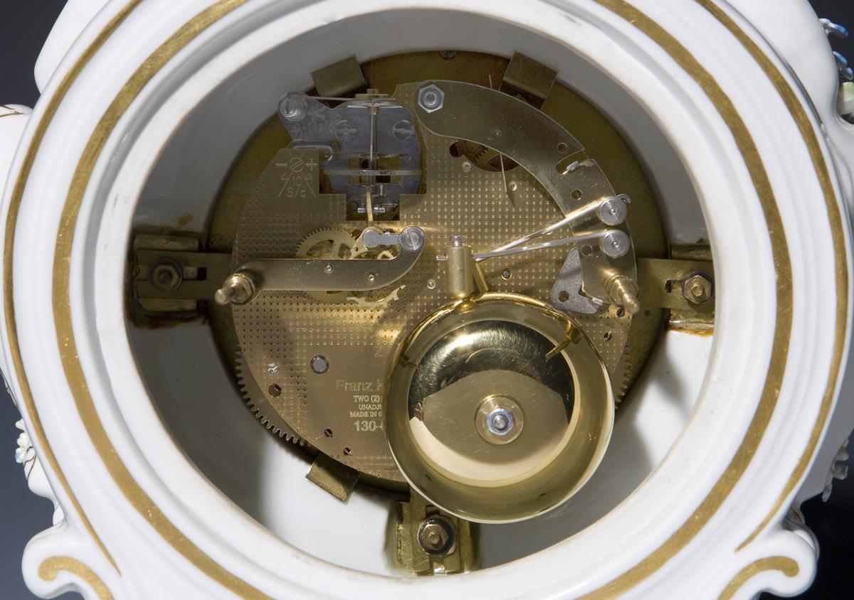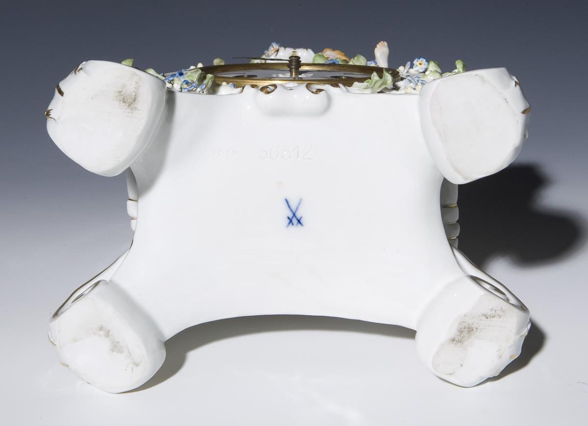 Modell von Ernst August Leuteritz 1865-1875. Farbig bemalt, reliefiert, gold staffiert. Plastisch aufgelegte, naturalistisch bemalte Vergißmeinnicht-Blütenzweige. Uhrwerk mit Schlüsselaufzug, Schlagwerk auf zwei Glocken. Pressnummern, Schwertermarke. Einige Blüten, Blätter bestoßen, Zifferblatt am Aufzug leicht bestoßen, Uhrwerk-Aufzug defekt.