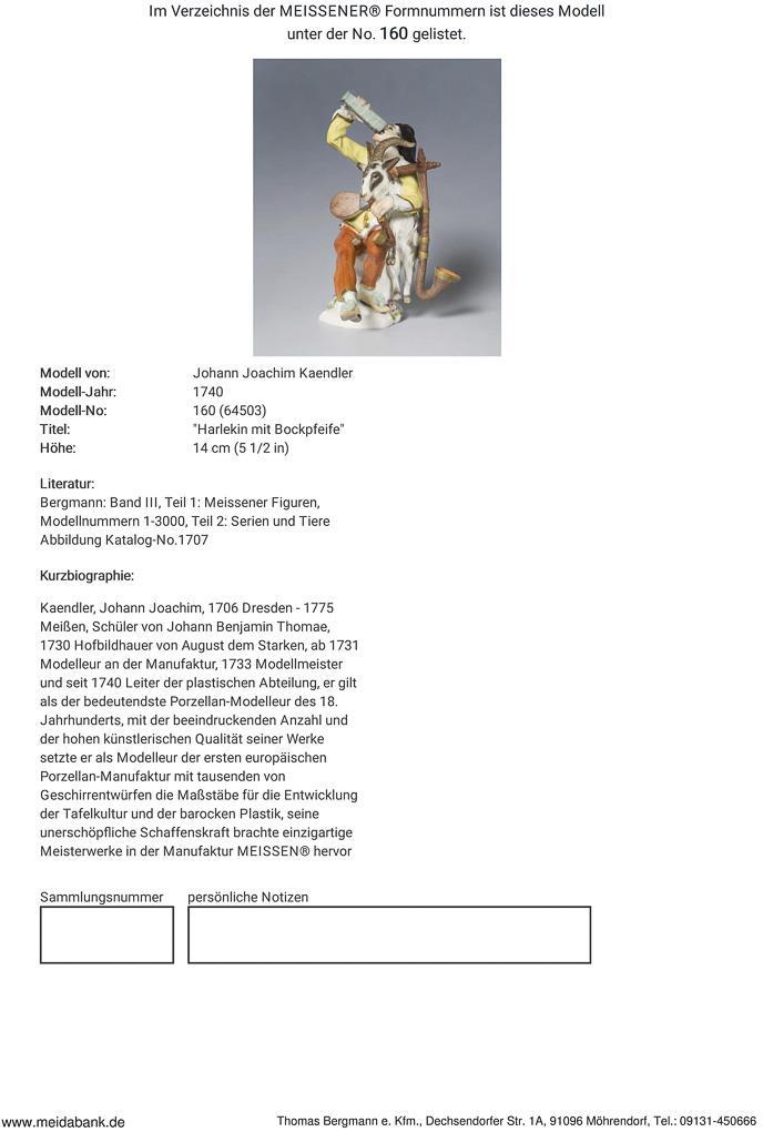 Modell von Johann Joachim Kaendler 1740. Farbig bemalt, gold staffiert. Kaendler: "Harlequin, wie Er auf einem Postament sizet und einen Dudel Sack in Händen hat nebst einem Paß Glaß und trincket". Ritzmarke, Pressmarke, Malermarke, Schwertermarke.