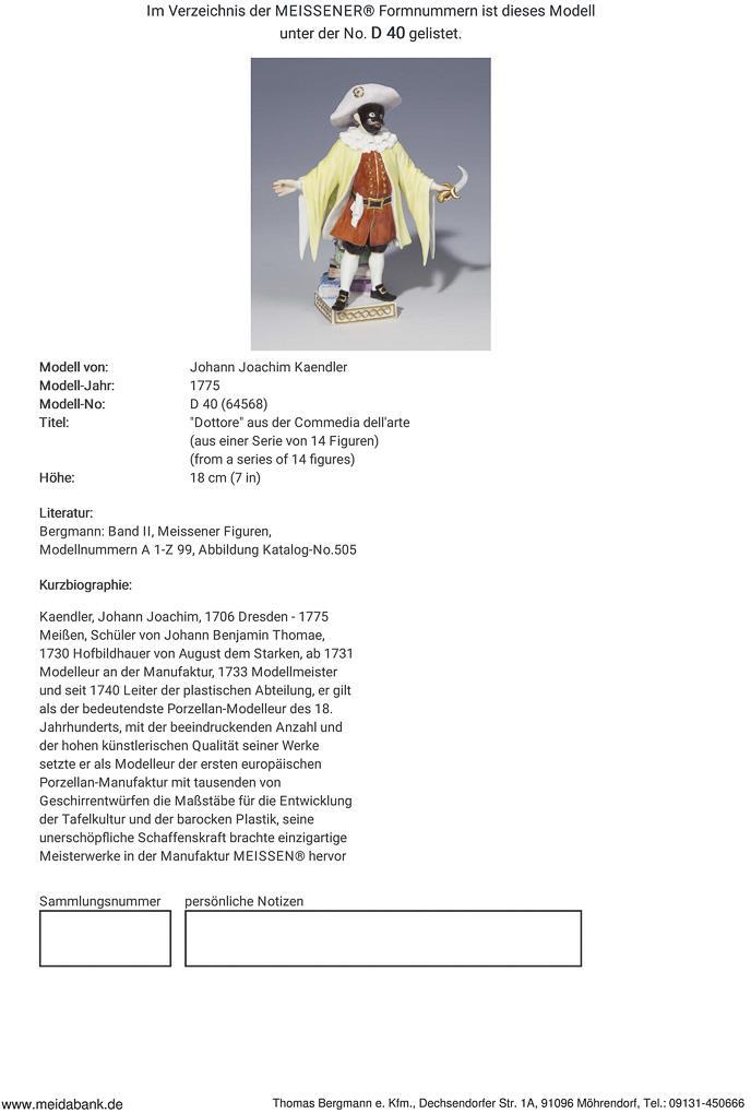 Modell von Johann Joachim Kaendler 1775. Farbig bemalt, gold staffiert. Dottore ist Jurist oder Arzt, zeichnet sich durch gelehrtes Geschwätz aus, mischt Fachbegriffe auf komische Weise, ist geizig, eitel, ständig zu Liebschaften aufgelegt und nimmt gern einen Schluck Wein zuviel. Ritzmarke, Pressmarke, Malermarke, Schwertermarke. Eine Mantelspitze leicht bestoßen, Sichel geklebt.