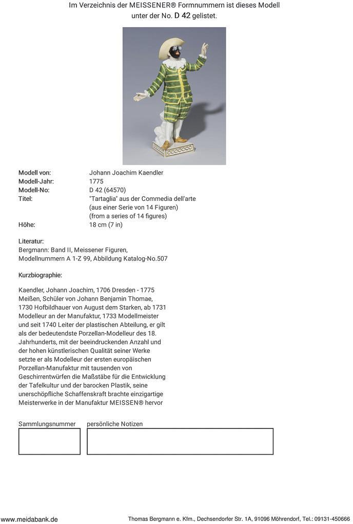 Modell von Johann Joachim Kaendler 1775. Farbig bemalt, gold staffiert. Tartaglia, ein Beamter mit übergroßer Brille, sein Bäuchlein und seine Bedeutung vor sich hertragend, die Würde ist durch sein Stottern beeinträchtigt. Ritzmarke, Pressmarke, Schwertermarke.