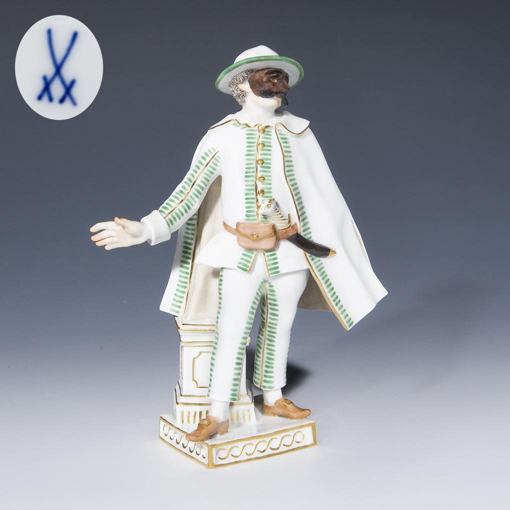 Modell von Johann Joachim Kaendler 1771. Farbig bemalt, gold staffiert. Brighella, ein schlauer Bauer, Verächter aller Unterwürfigkeit, redegewandt und schlagfertig ist er allen Situationen gewachsen, in Lebensgefahr gerät, wer ihn beleidigt. Ritzmarke, Pressmarke, Malermarke, Schwertermarke.