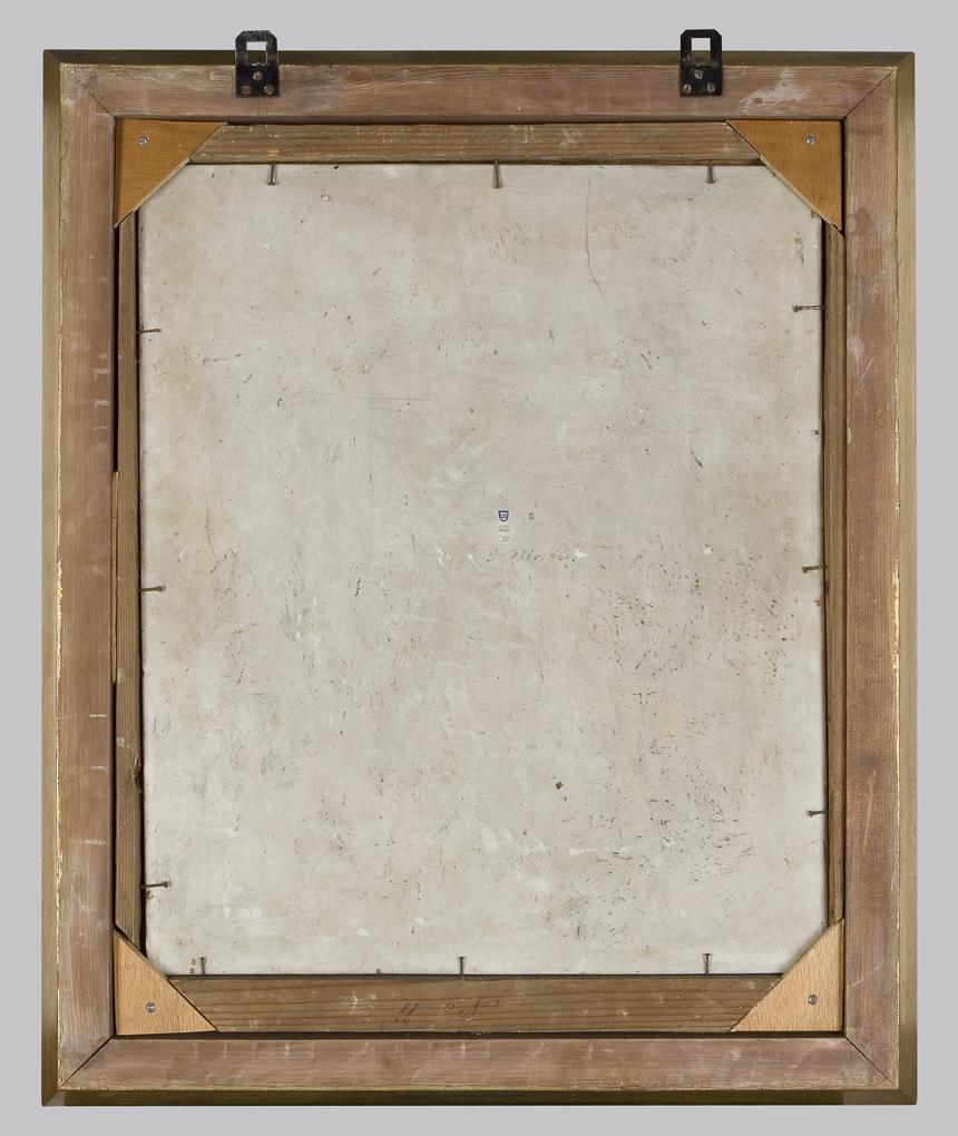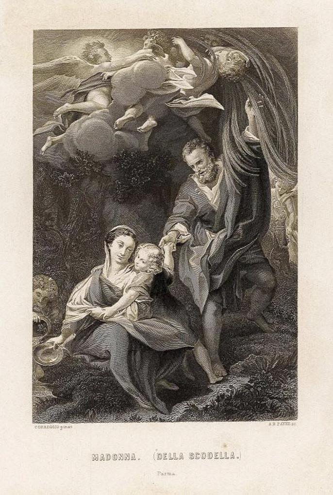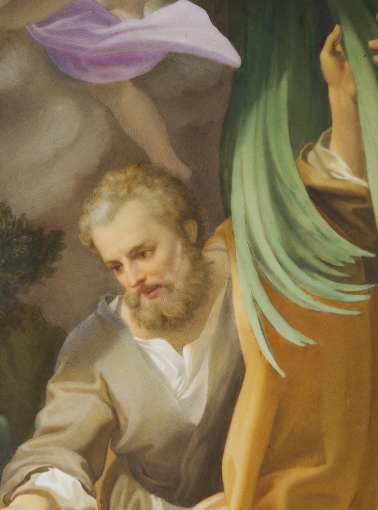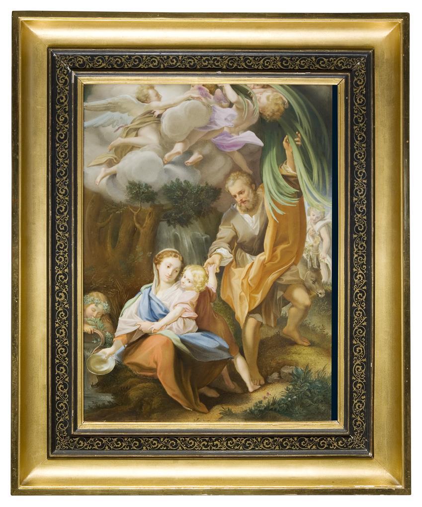 Feine farbige Bemalung nach der Gemälde-Vorlage von Antonio da Correggio (Antonio Allegri, 1489 Correggio - 1534 Correggio). Das Gemälde (217 x 137 cm) hängt in der Galleria nazionale di Parma. Es wurde für die Kirche San Sepolcro in Parma gefertig. Das Bild ist auf einer diagonalen Linie aufgebaut, die links unten mit der Schale beginnt und durch die Hände der Jungfrau, dem Jesuskind und von Josef nach oben verläuft, die Pose Jesu fungiert als Bindeglied. Unsigniert, unglasierter Boden, Pressmarken mit Jahreszahl, Ritzmarke, Bindenschild. Profilierter Goldrahmen mit schwarzer Ornamentleiste. Minimaler Brandriss am oberen Rand, Rahmen-Maße für das Bildmotiv der Platte nicht passend.