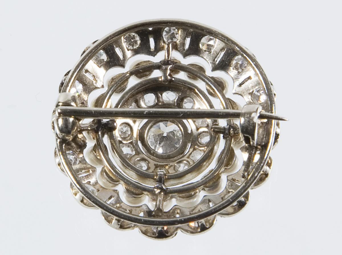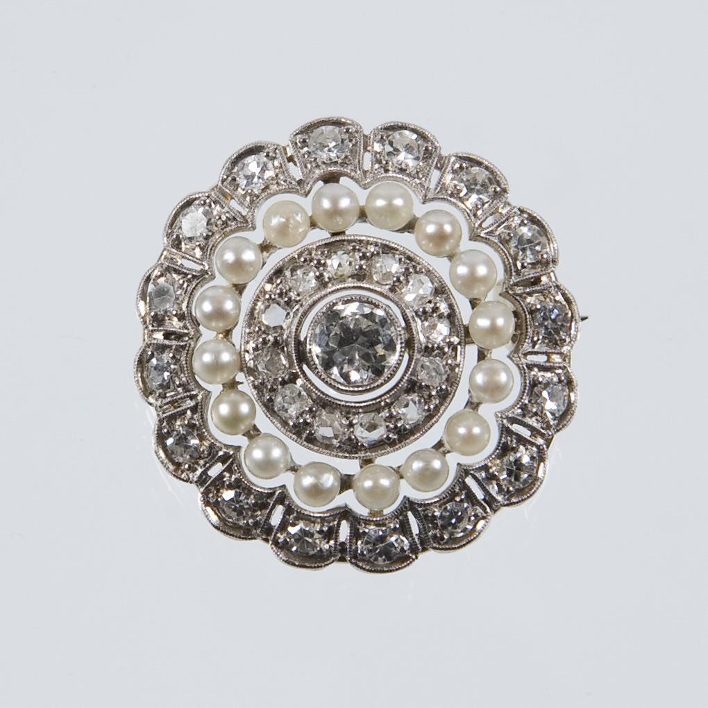 Zahlreiche kleine Diamantrosen und Flussperlchen. 1 Altschliff-Brillant circa 0.25 ct. Ohne Punzen, Feingehalt mit Säure geprüft.