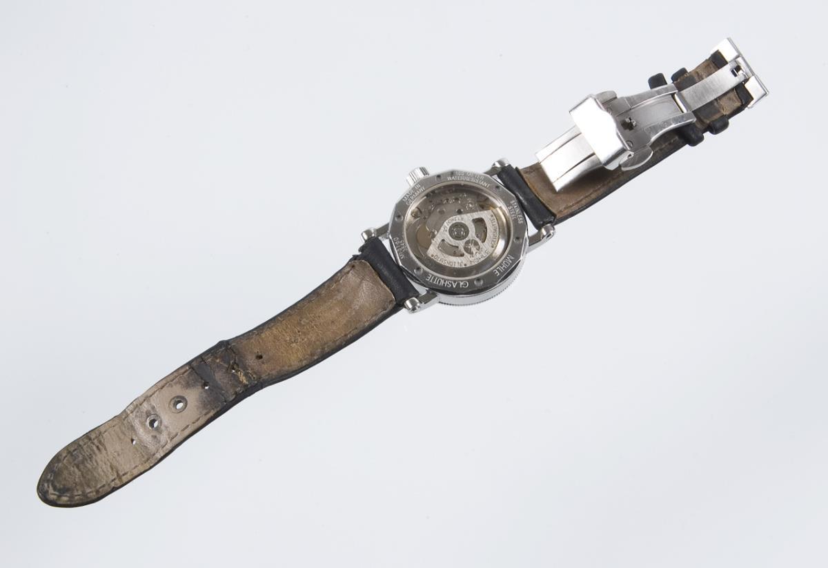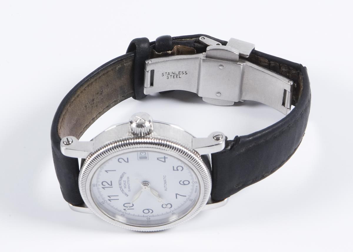 Automatikwerk. 25 Steine. Wasserdicht bis 100 Meter. Saphirglas. Weißes Zifferblatt, schwarze arabische Zahlen, Zeiger mit Leuchtmasse. Große Sekunde, Datum-Fenster. Geriffelte Lünette. Verglaster Boden. Original-Lederband mit Doppelfaltschließe. Etui von Goldschmied Schott, Nürnberg. Im Kurzzeit-Test funktionsfähig. Lederband muss erneuert werden, die originale Faltschließe kann beibehalten werden, minimaler Kratzer neben der Lünette.