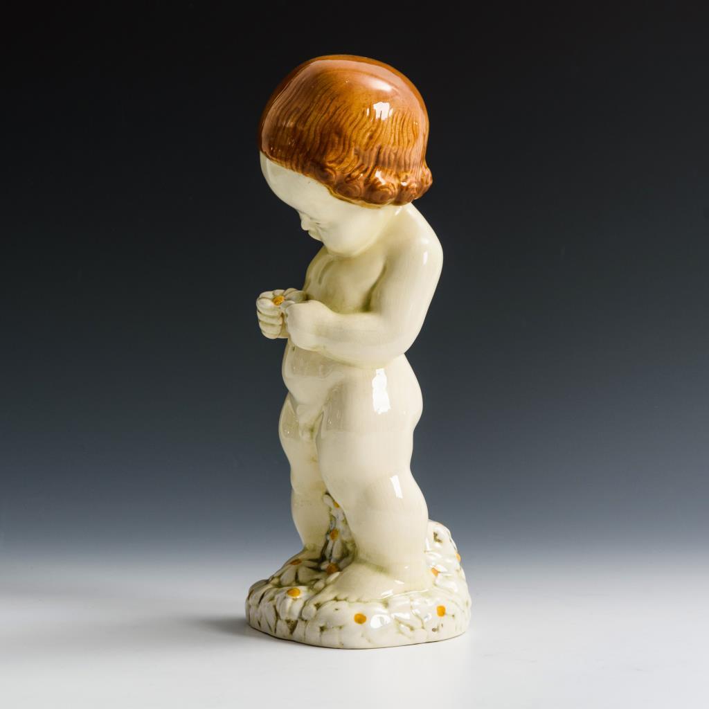 An einem Margaritenblatt zupfender Putto, auf Blütensockel. An Brust und Hals restauriert.