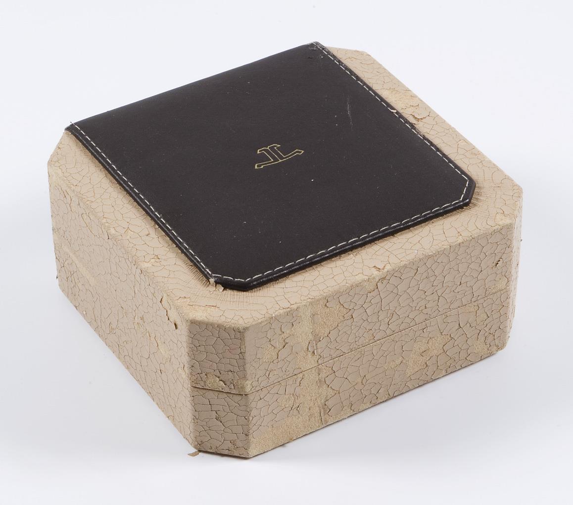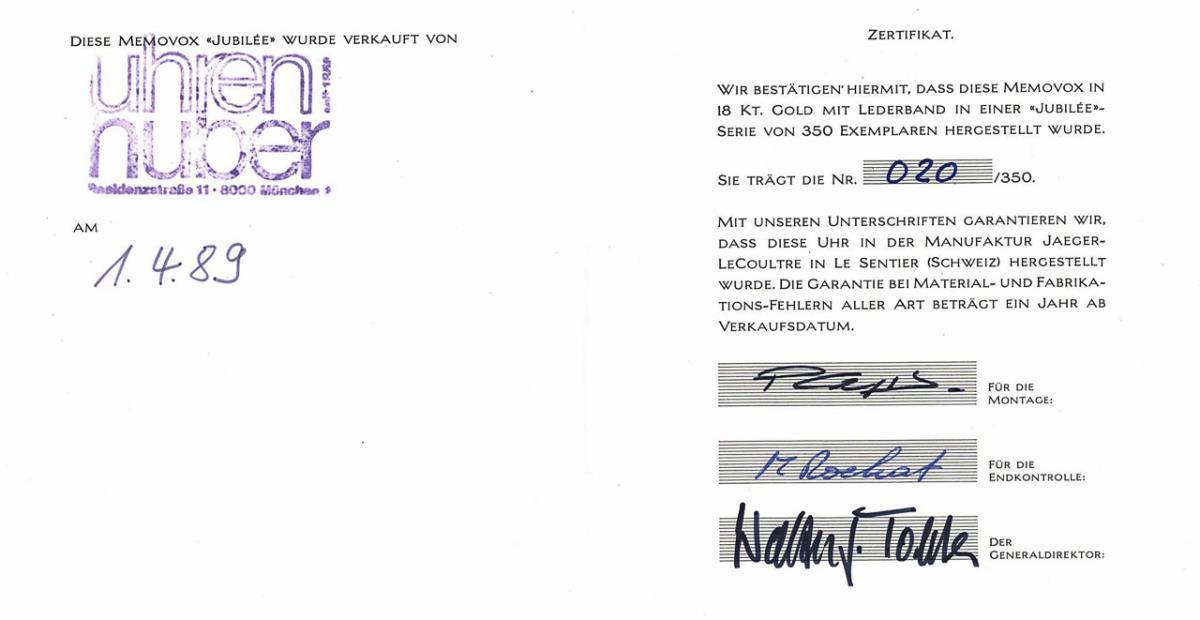 Limitiert, nummeriert: 020/350. Automatikwerk. Kaliber 916. Silbernes Zifferblatt. Große Sekunde, Datum-Fenster. Dreieckiger Wecker-Index, Strichzahlen. Huber-Lederband mit vergoldeter Jaeger-LeCoultre-Dornschließe. Zertifikat, Bedienungsanleitung. Original-Box. Im Kurzzeit-Test funktionsfähig. Beschichtung der Box defekt.
