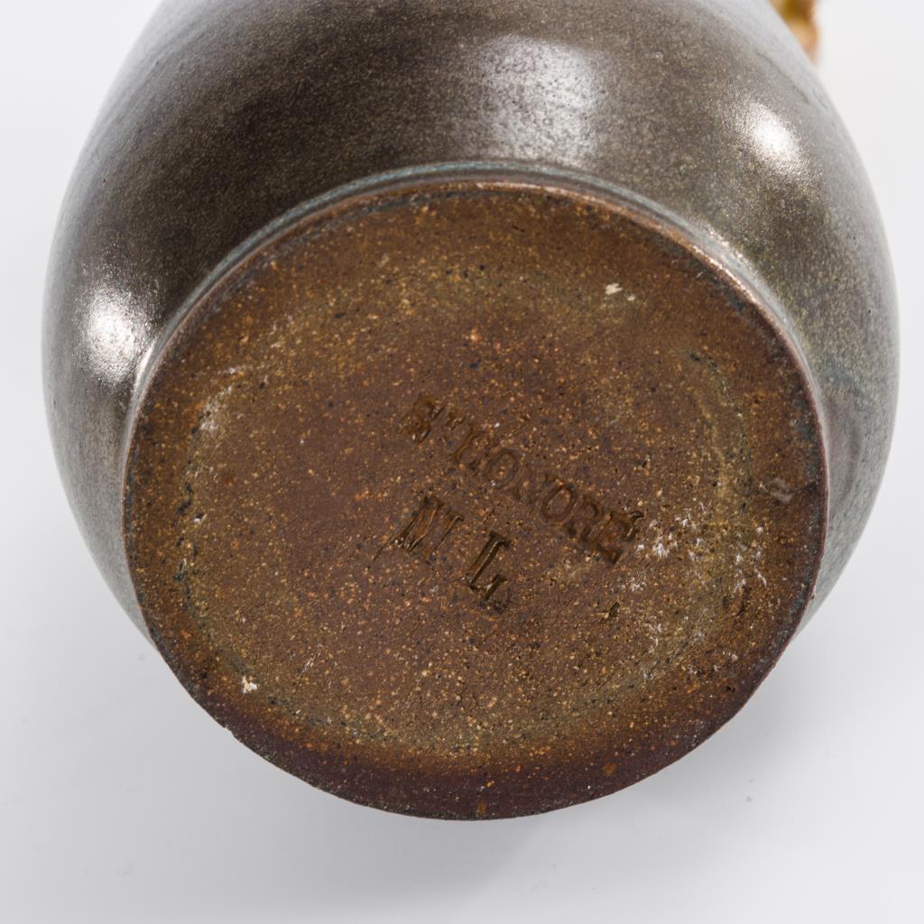 Steinzeug, ockerfarbene Laufglasur auf steingrauem Fond.H 23 cm.
