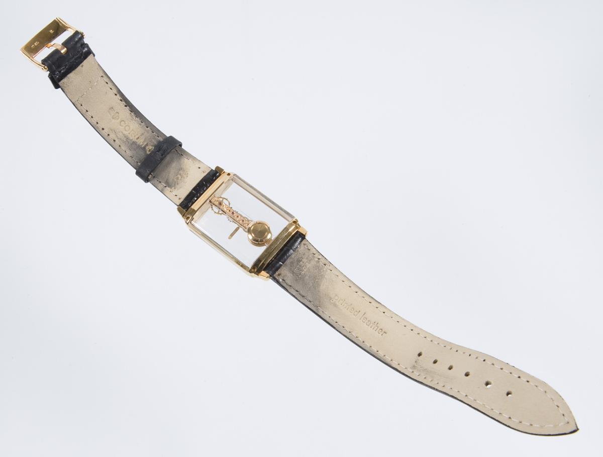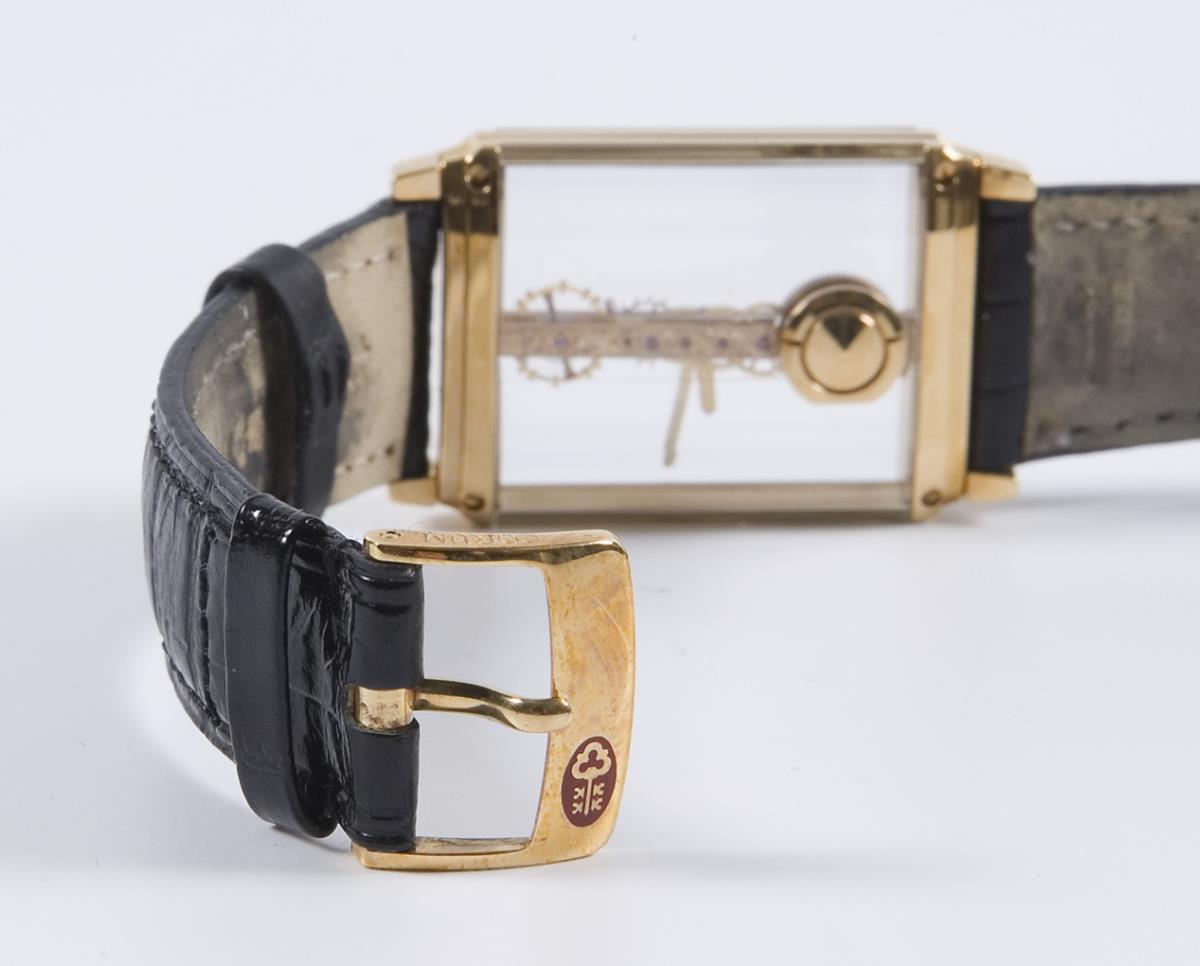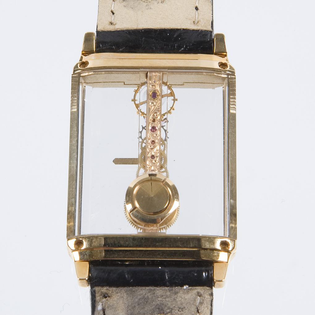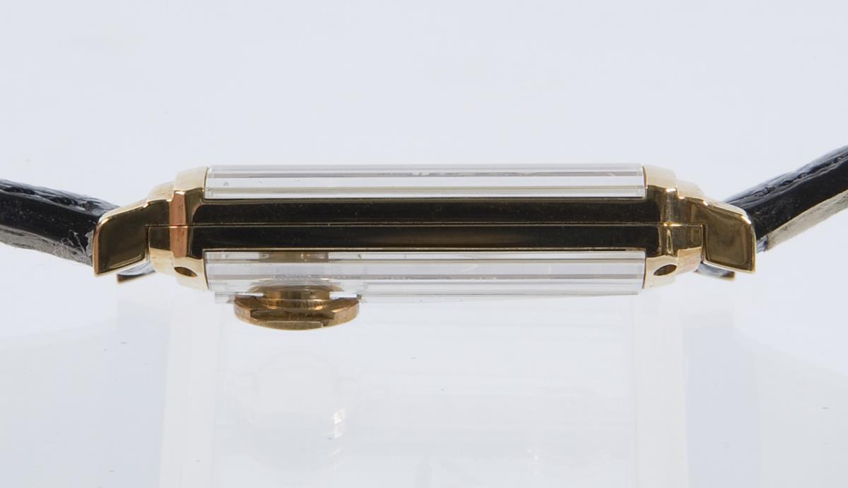 Handaufzug. Ankerwerk in Stabform. Aufzug und Zeigerstellung im Boden. Beidseits facettiertes Saphirglas. Gehäuse rückseitig verschraubt. Original-Lederband mit Gold-Dornschließe gebraucht, dabei neues Original-Lederband. Garantieschein, Gebrauchsanweisung. Original-Box, Karton. Innenbeschichtung der Box defekt.