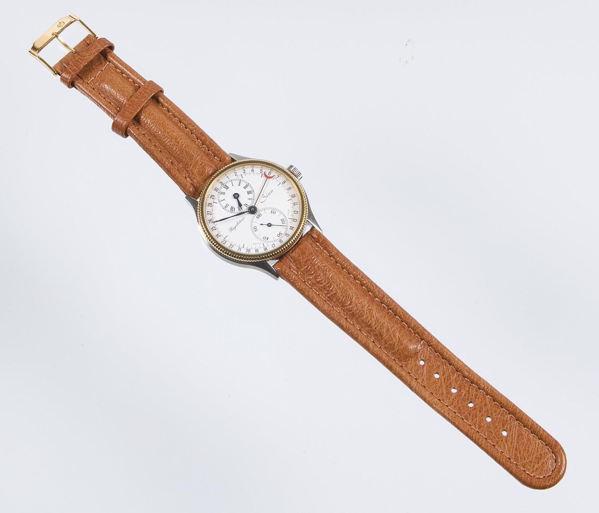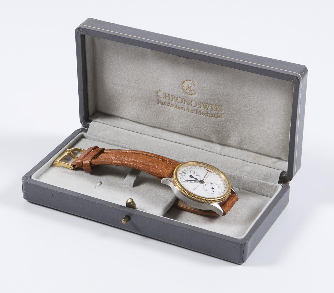 Handaufzug. Schweizer Werk, Kaliber Unitas 6425. Werk mit Genfer Streifen. 17 Steine. Saphirglas, weißes Zifferblatt, gebläute Stahlzeiger. Hilfszifferblätter für kleine Sekunde und Stundenanzeige. Umlaufend Datumsanzeige. Verglaster Boden. Lederband mit Dornschließe. Chronoswiss-Box. Das Unternehmen wurde 1961 von Helmut Sinn gegründet. Der Pilot entschloss sich unter eigener Marke Uhren in der Schweiz fertigen zu lassen und diese in Deutschland zu verkaufen. Im Kurzzeit-Test funktionsfähig.