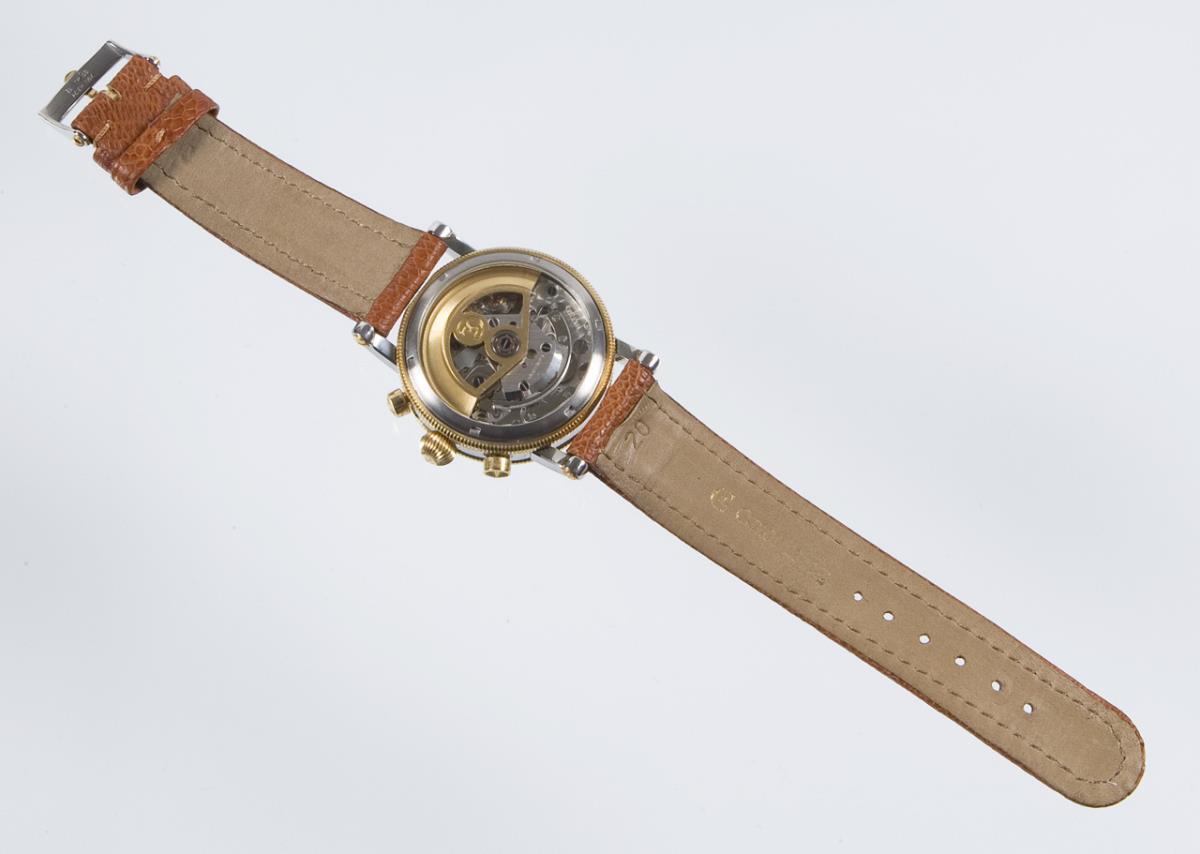 Schweizer Automatikwerk. Kaliber Valjoux 7750. Wasserdicht bis 30 Meter. 17 Steine. Saphirglas, guillochiertes massives Sterlingsilber-Zifferblatt, gebläute Stahlzeiger. Hilfszifferblätter für kleine Sekunde, 30-Minuten- und 12 Stundenzähler. Verglaster Boden. Original-Lederband mit Dornschließe. Im Kurzzeit-Test funktionsfähig.