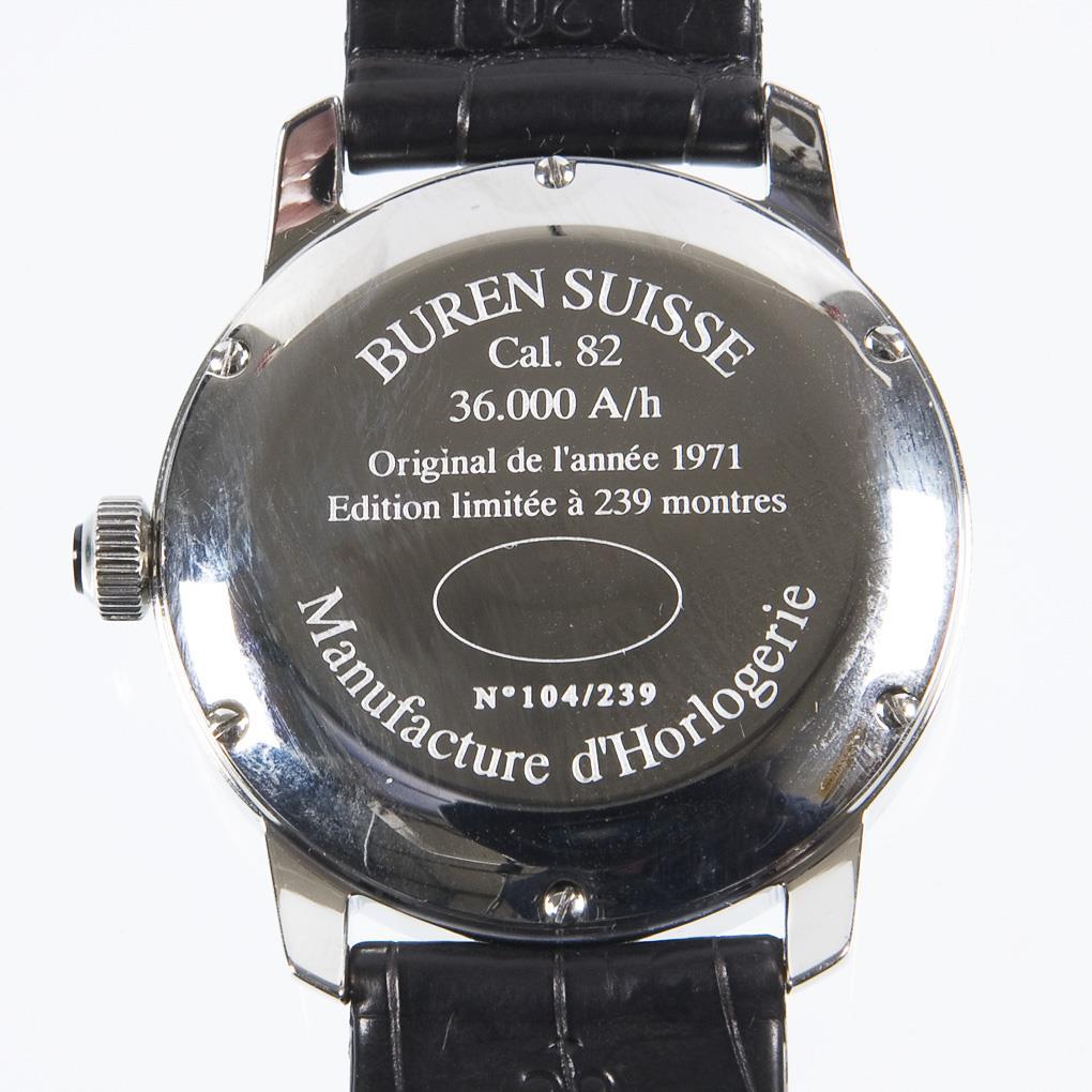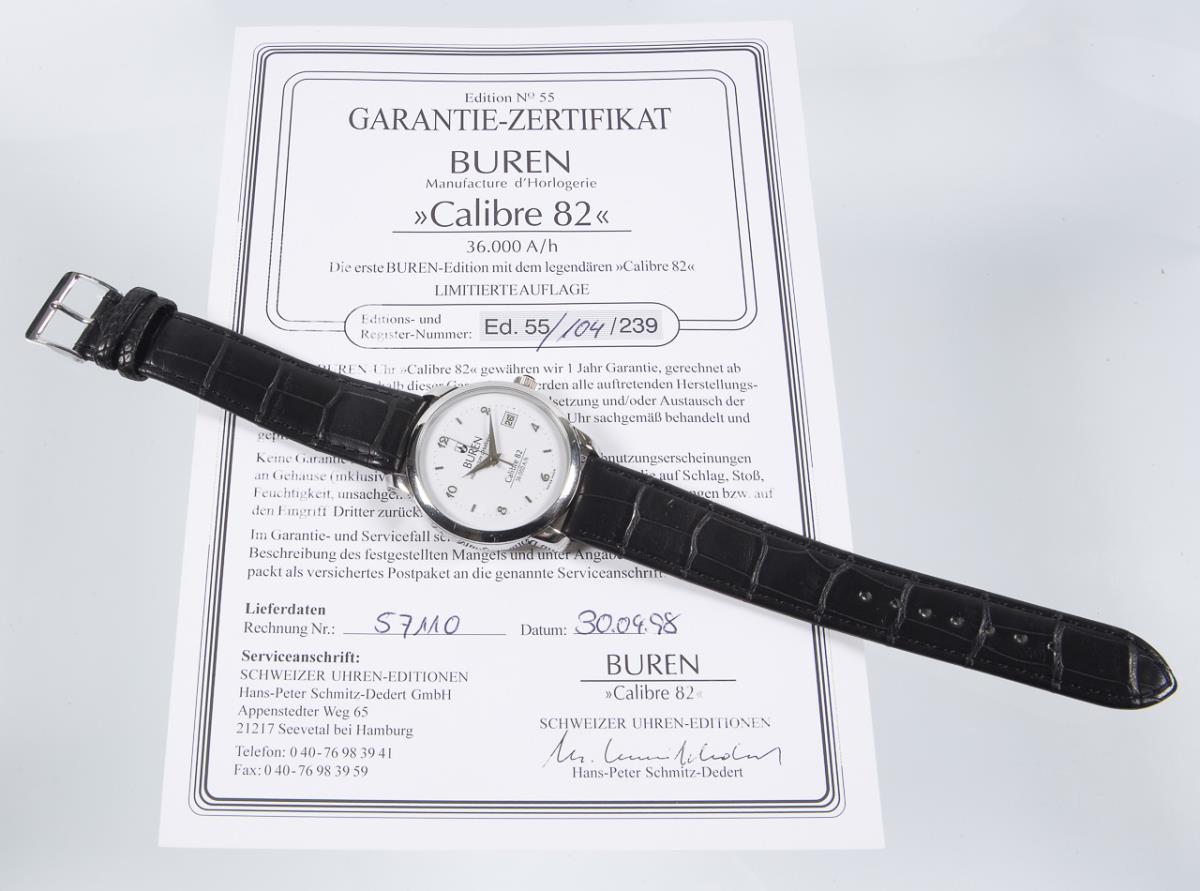 Limitiert, nummeriert: 104/239. Automatikwerk. Kaliber 82. Gangdauer 45-50 Stunden. Unruh mit erhöhter Frequenz von 36.000 Halbschwingungen. Wasserdicht bis 50 Meter. Saphirglas, weißes Zifferblatt. Datum-Fenster, große Sekunde. Verschraubter Boden. Lederband mit Dornschließe. Garantie-Zertifikat, Verkaufsjahr 1998, Gebrauchsanweisung. Original-Box. Im Kurzzeit-Test funktionsfähig.